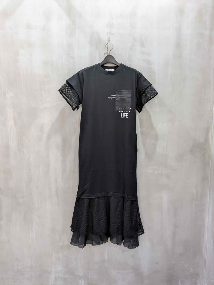 肩を落としたゆるやかなシルエットと、ロングTシャツ×スカートを重ねたようなデザインが、リラクシーな着心地とモードな雰囲気を両立。胸元には“透けを楽しむ”を意味するロゴに、シアーポケットを重ねたユニークなディテールもポイントです。