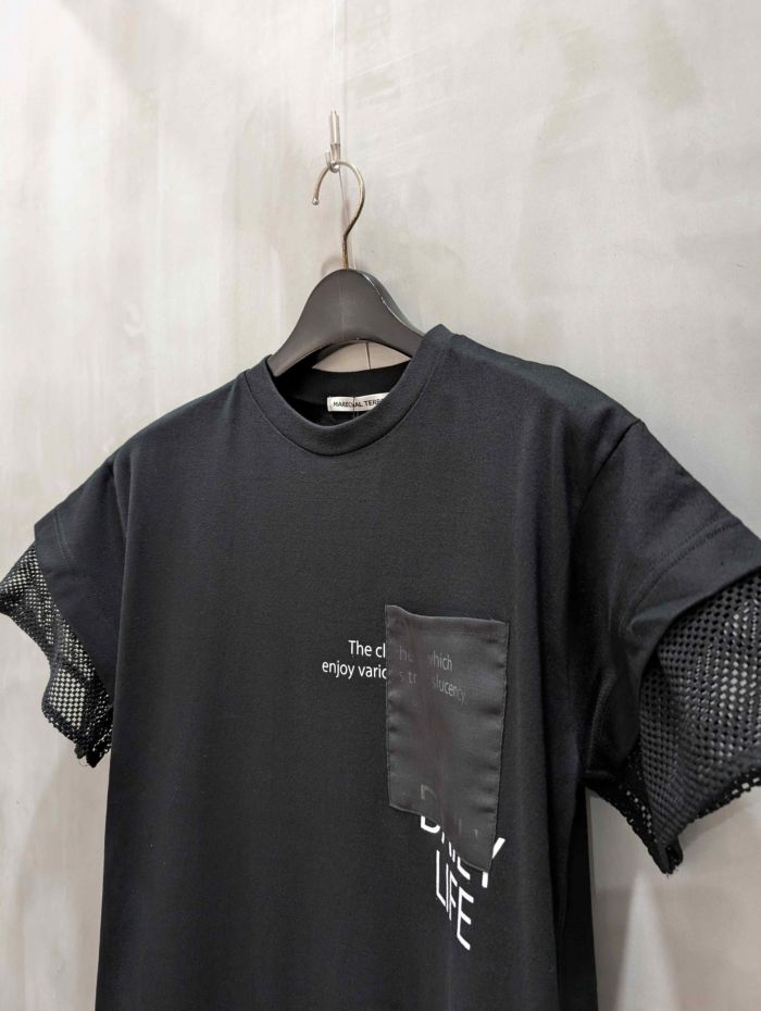カットソー素材をベースに、オーガンジーとメッシュをジョイントした異素材ミックスの一枚です。