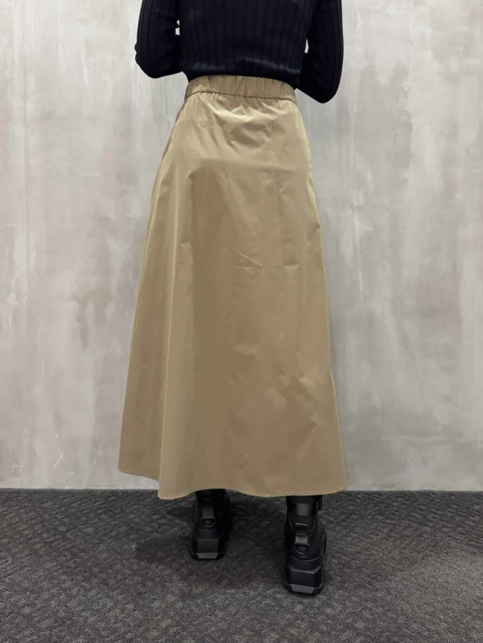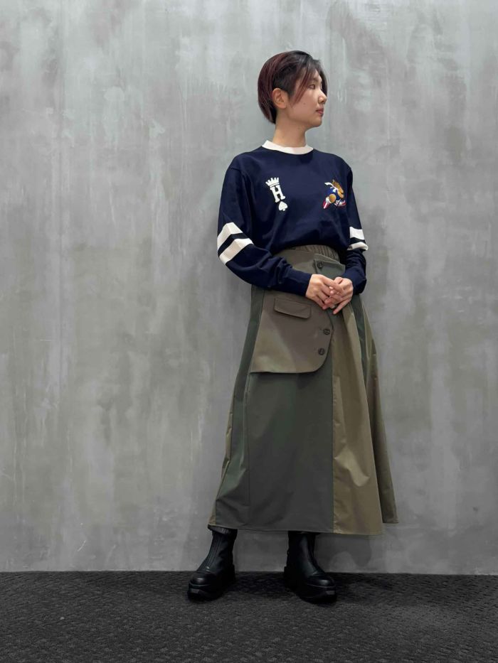 デイリーにモードなアクセントを加えるスタイリングから、ジャケットやシャツと合わせたエッジの効いた着こなしまで幅広く対応。コーディネート次第で大人の洗練された雰囲気もカジュアルな抜け感も演出できる、存在感抜群のスカートです。