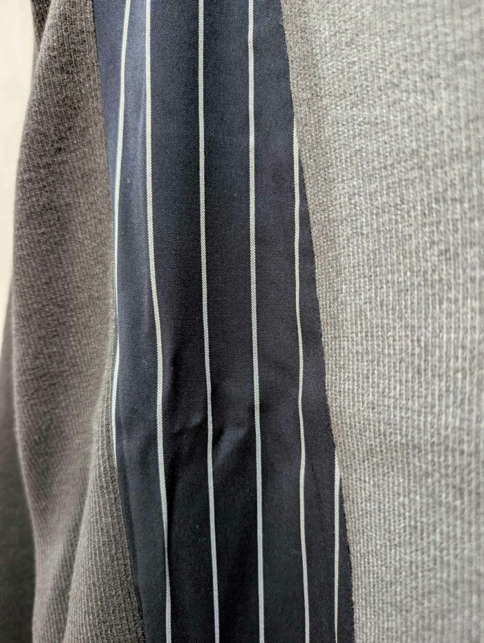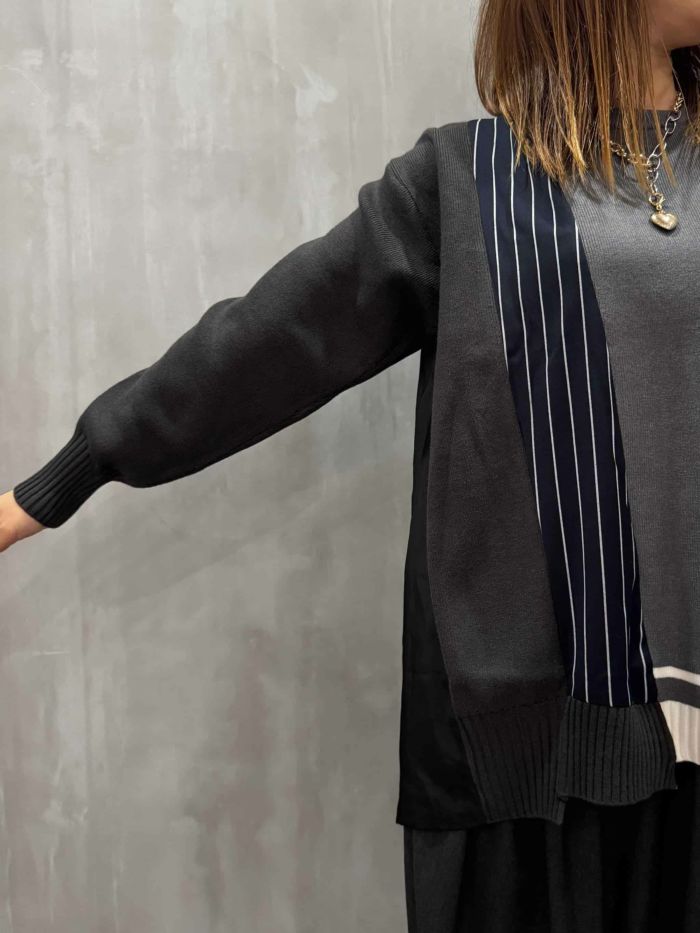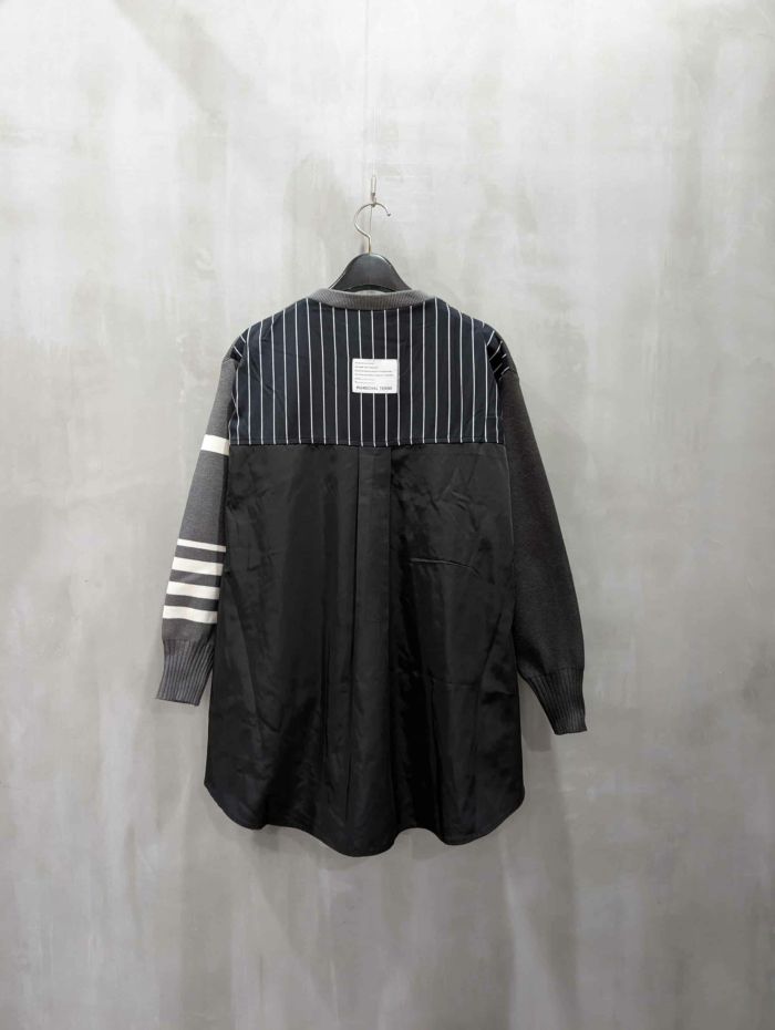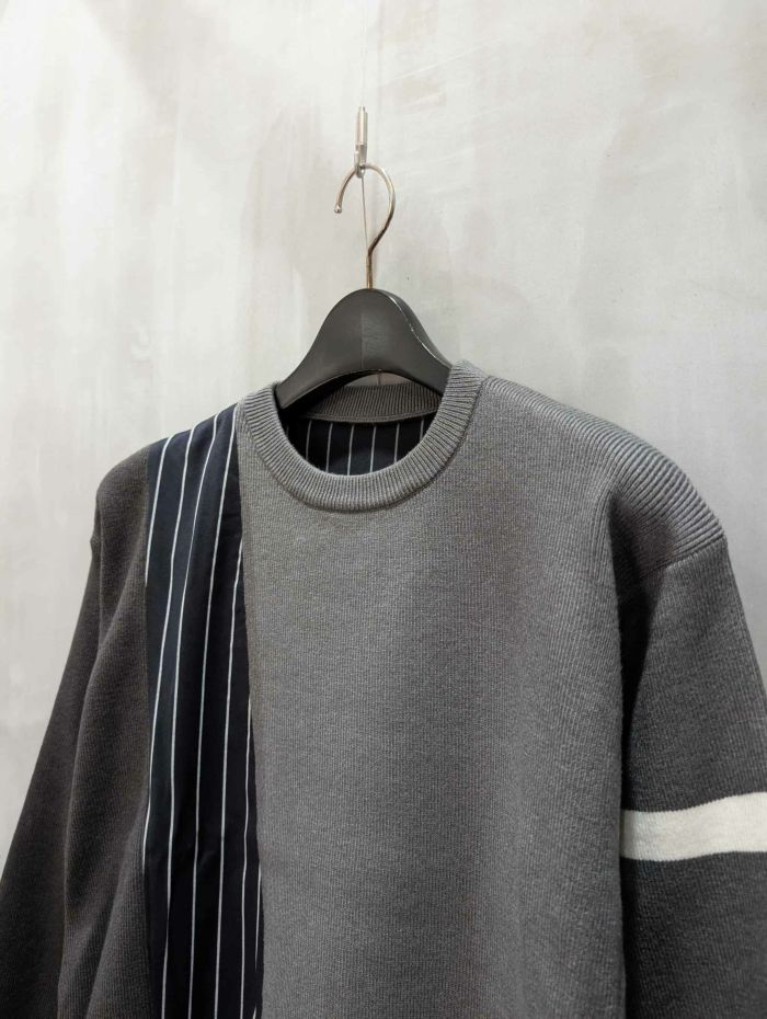 前身頃にはストライプやチェック柄の布帛がアクセントとして入り、立体感を作り出すディテールです。