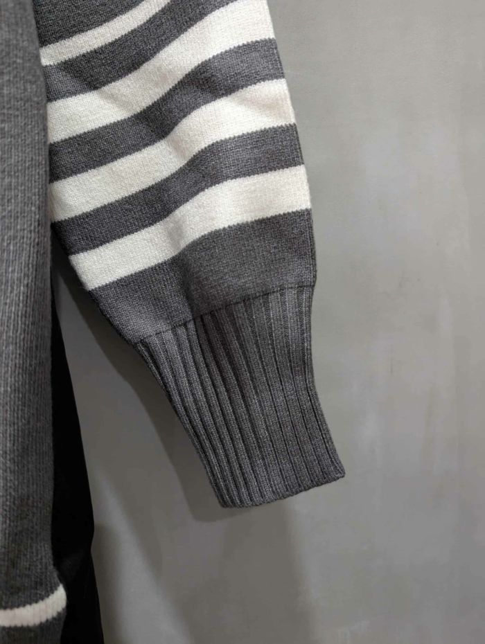 ■身頃と袖をニットで編立て、左袖に5本の配色ラインを入れ、右前裾リブにも配色ラインを入れ、トラッドな雰囲気を演出