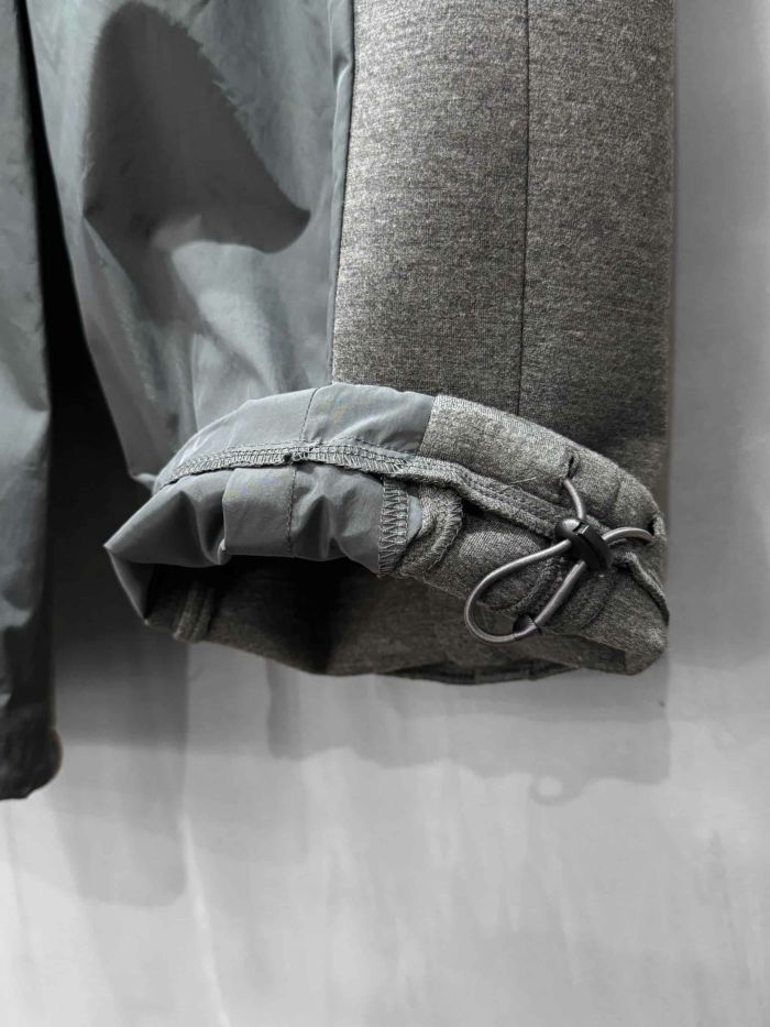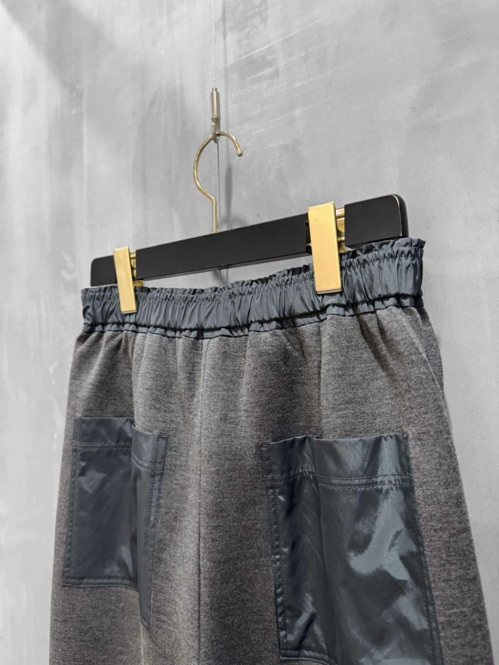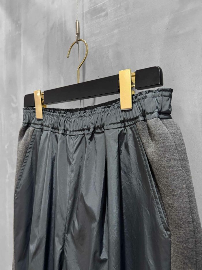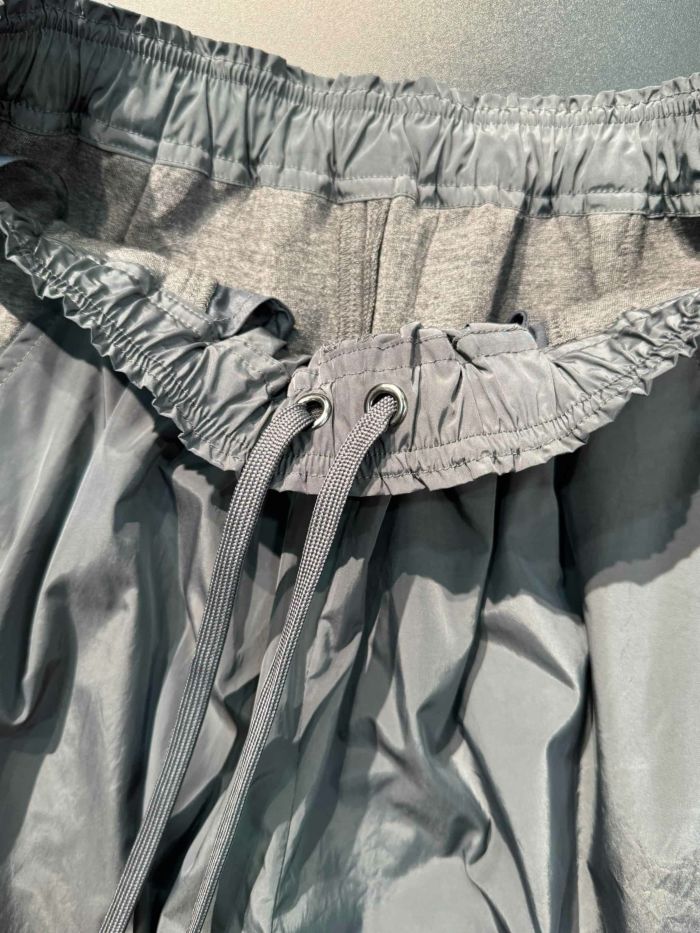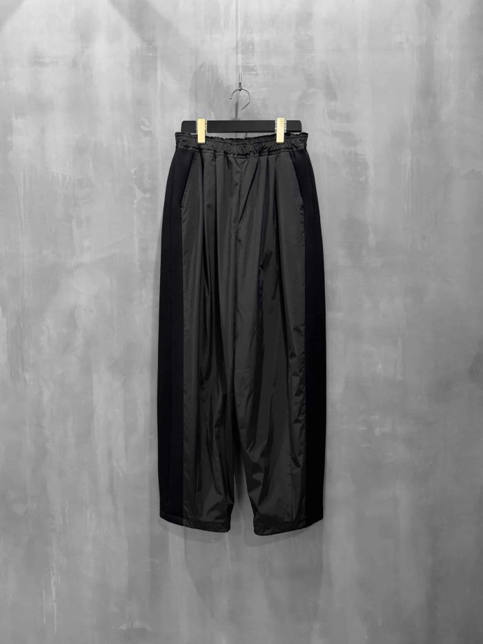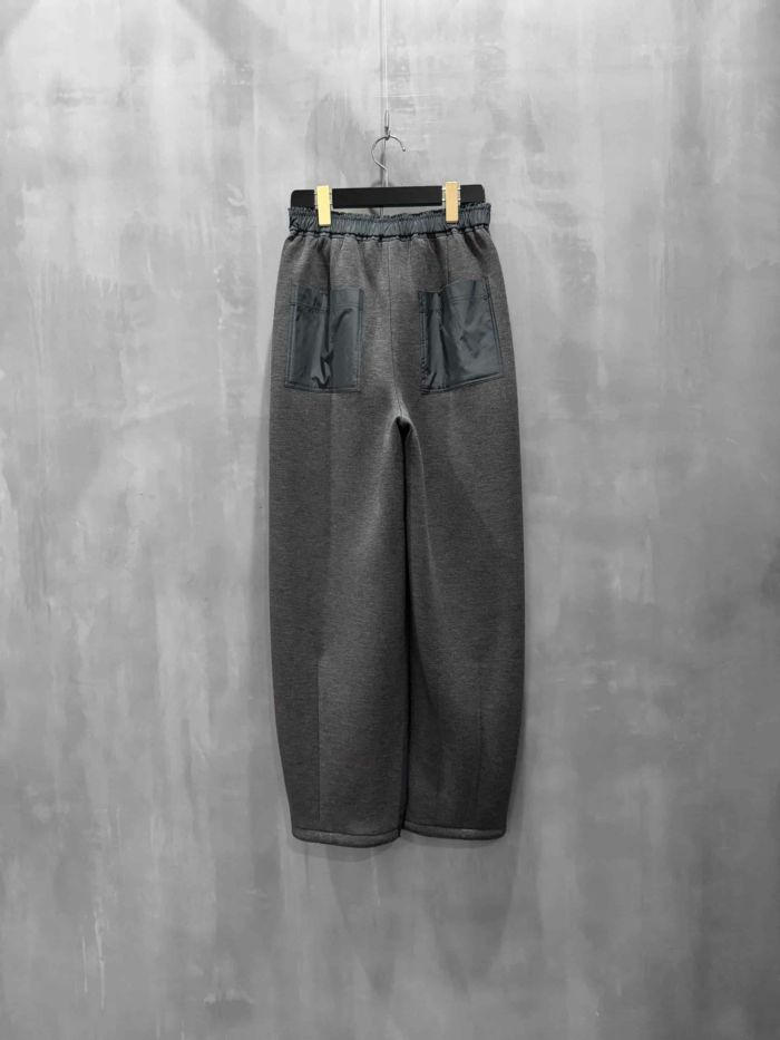 ダンボールニットとポリエステルのタフタ素材をドッキングしたパンツ。