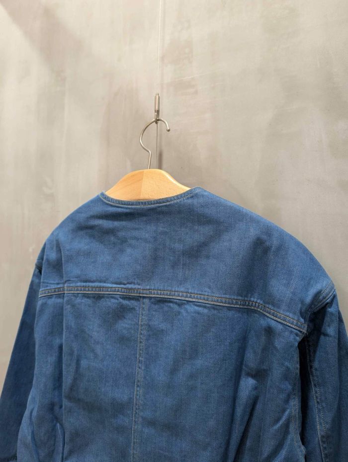 ポケットディテールが際立つミニマルデザインが魅力の一着。襟をなくしたノーカラー仕様により、デニム特有のカジュアルさを抑え、大人の女性にふさわしい洗練された雰囲気を演出します。綿100%ながらソフトで柔らかな風合いのデニムを使用し、軽やかで快適な着心地を実現。オリジナルのタックボタンがさりげないアクセントになり、シンプルながら個性を感じさせる仕上がりです。