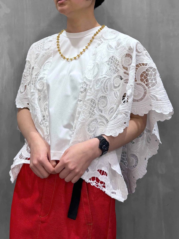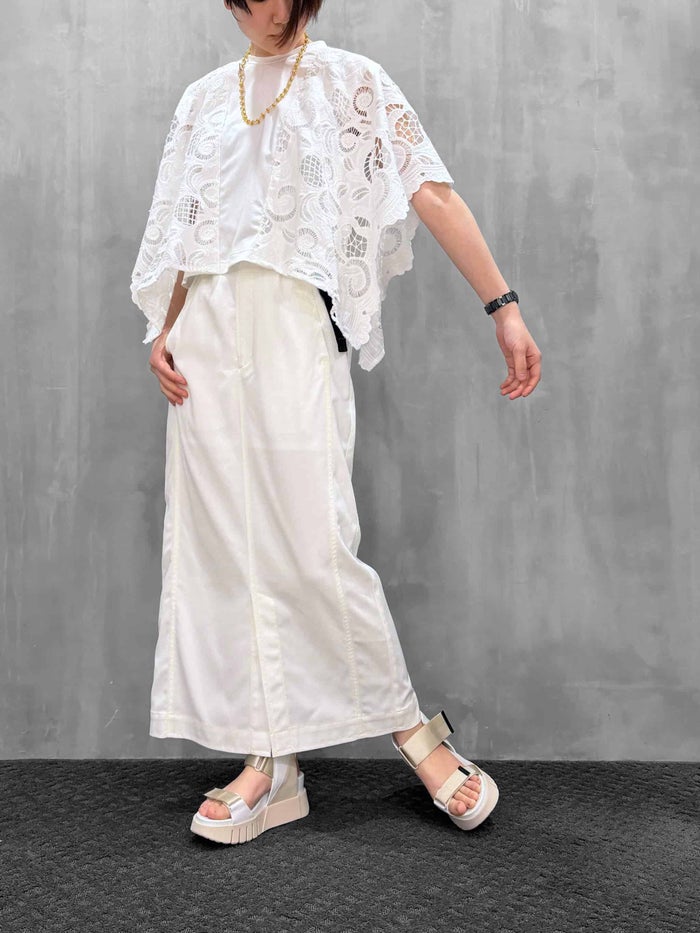 スリーブレストップスの上から、デザイン性の高いレース生地を重ねたドッキングトップス。