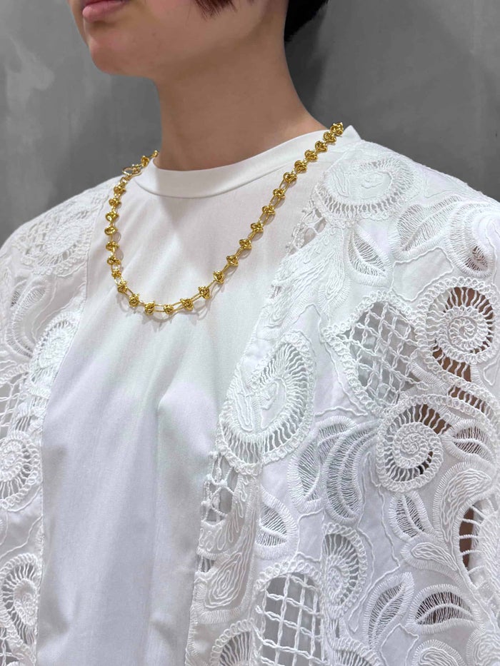一般的なボーラーレース(穴を開け周りに刺繍をして柄を作ったレース)にはない柄の大きさが特徴で、大小さまざまなボーラーで構成された柄が迫力ある刺繍生地となっています。
