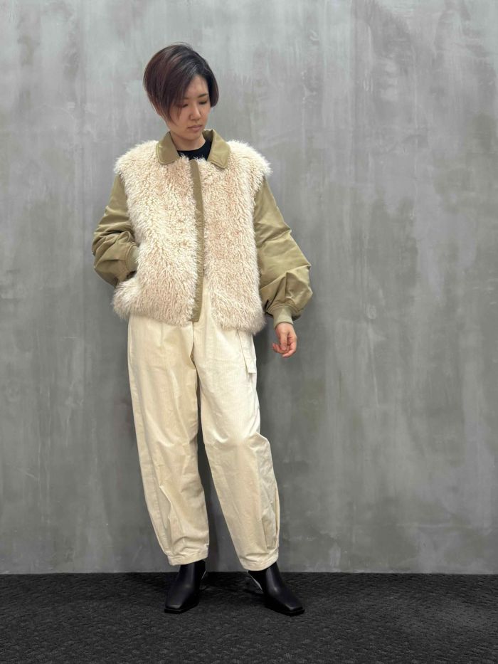 オーソドックスなMA-1よりラグジュアリーで、ファーアイテムとしてはよりデイリーに楽しめるハイブリッドな一枚です。