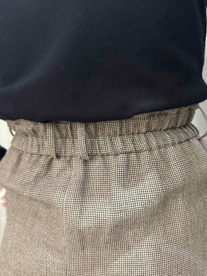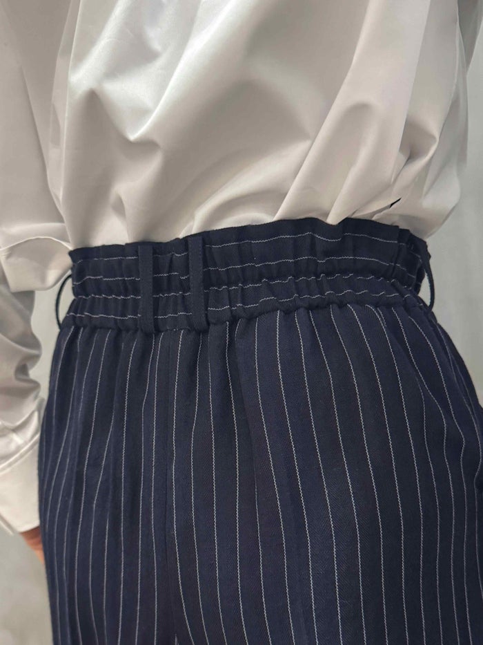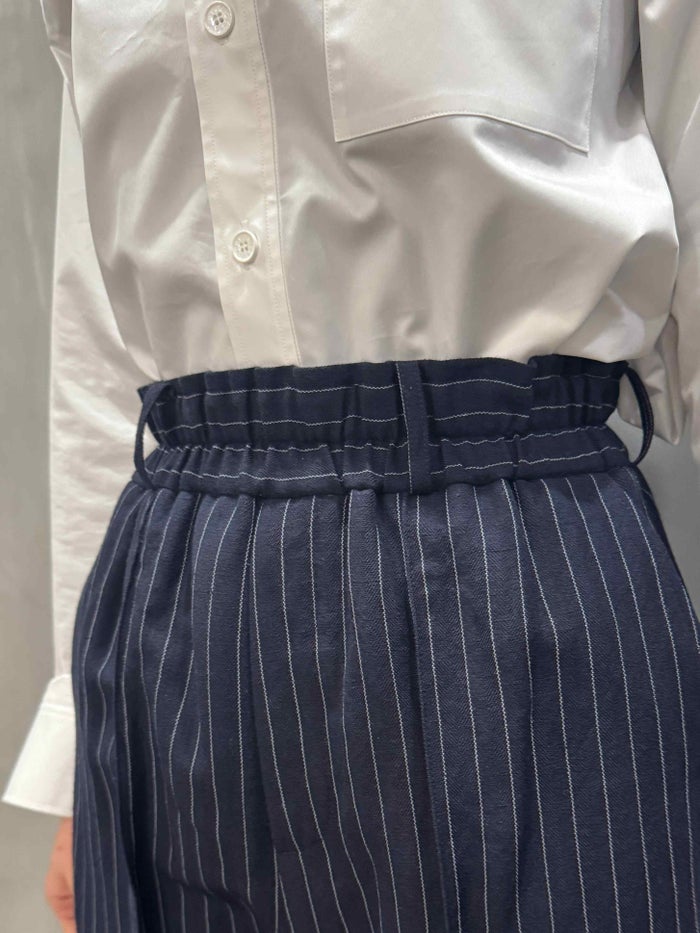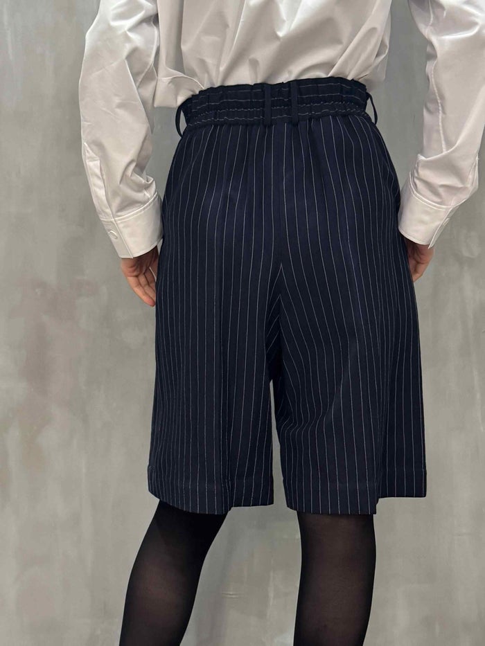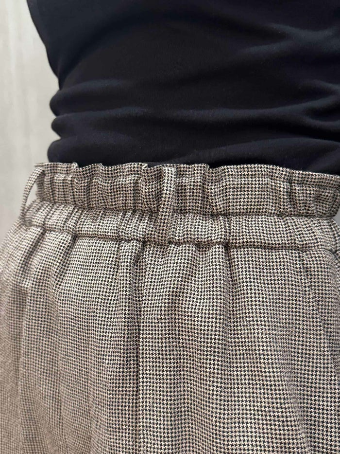 落ち着いた印象のピンストライプと千鳥のウールリネン生地のショートパンツ。