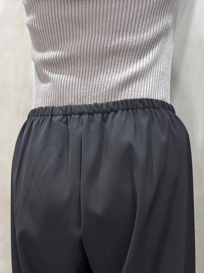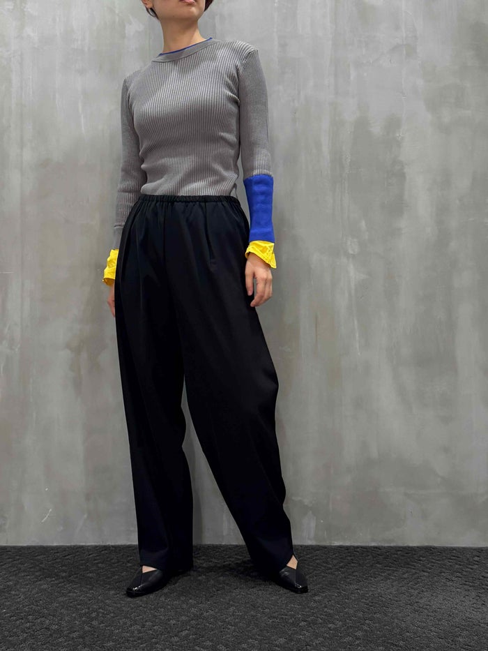 3シーズンの着用に対応したシルキーな質感にコンパクトな密度感に仕上げたダブルクロスのイージーパンツ。生地のハリ感を活かすため、前パンツにタックを施し、ユニセックスに履ける一本に仕上げました。シワになりにくく、ご家庭での手洗いが可能な機能素材。