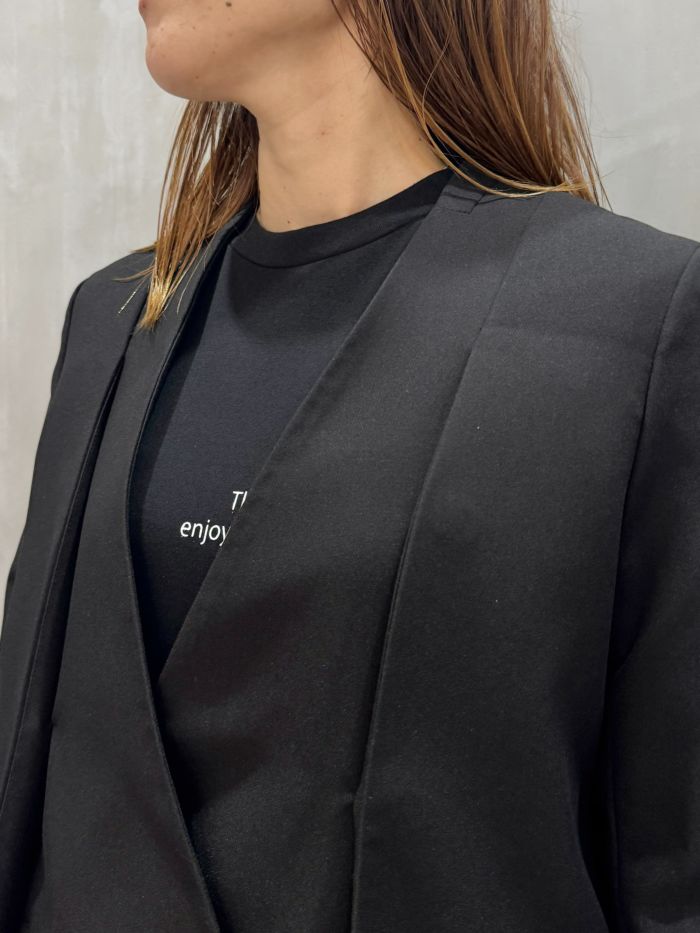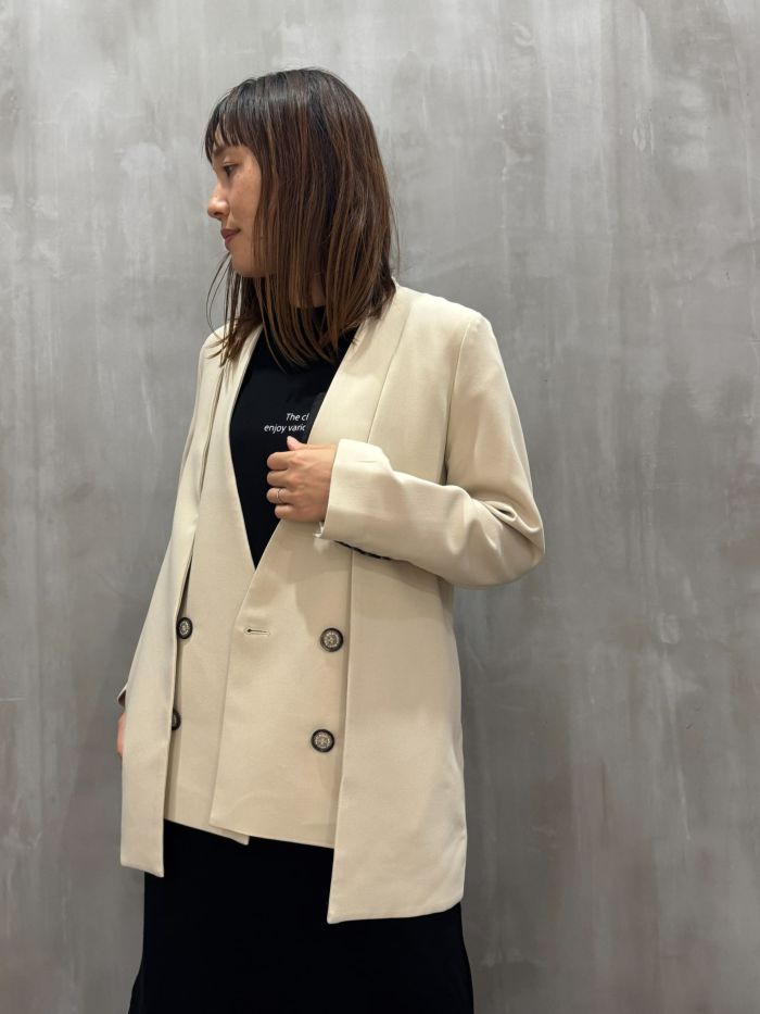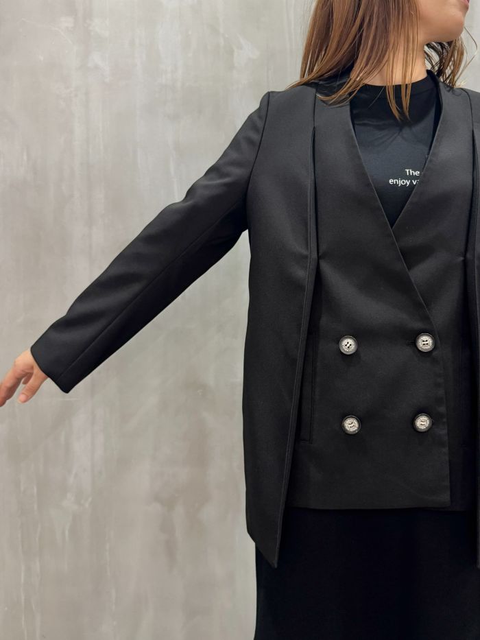 クラシックなテーラードカラーと、肩から流れるようなドッキングデザインが印象的で、シンプルなトップスやボトムスに羽織るだけでスタイリングが決まります。モードな空気感を持ちながら、オン・オフ問わず活躍する一着。