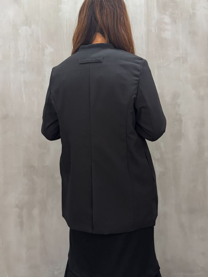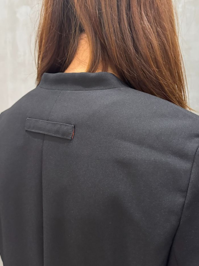 クラシックなテーラードカラーと、肩から流れるようなドッキングデザインが印象的で、シンプルなトップスやボトムスに羽織るだけでスタイリングが決まります。モードな空気感を持ちながら、オン・オフ問わず活躍する一着。
