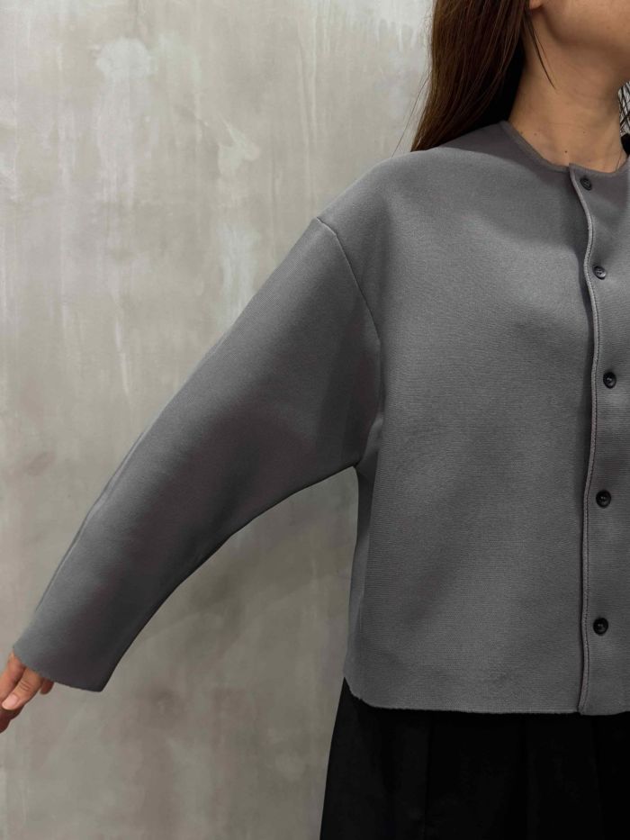 ニットの柔らかさとジャケットのきちんと感を兼ね備えた、SIWALY fluid(シワリーフルイド)のKnit Short Jacket。軽やかな着心地と上品なデザインで、デイリーからオフィスまで幅広く活躍するノーカラーショートジャケットです。