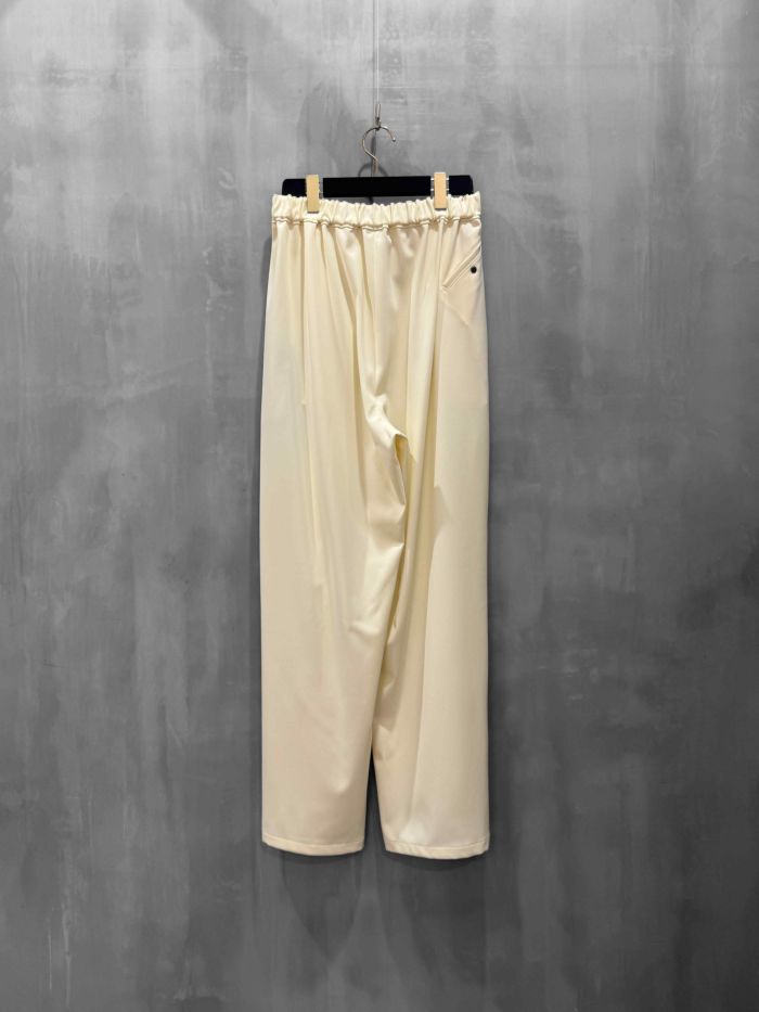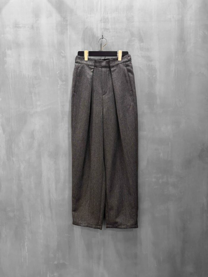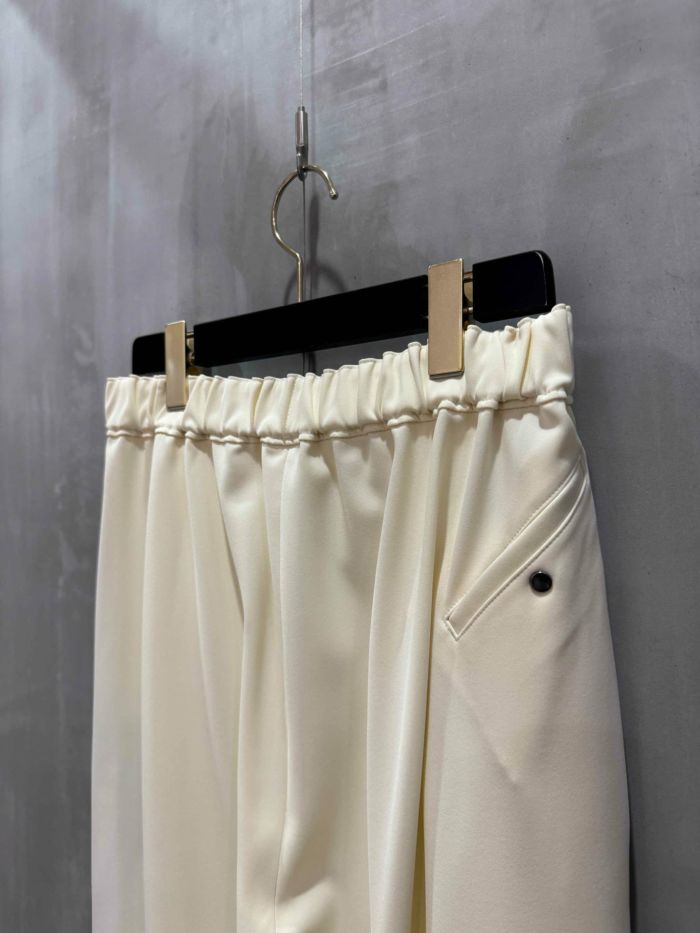 ウエストのドット釦でサイズ調節できるタックパンツ。