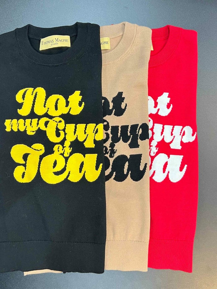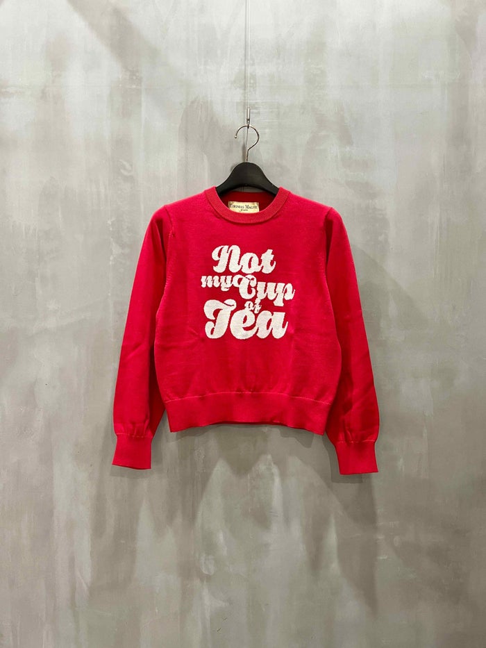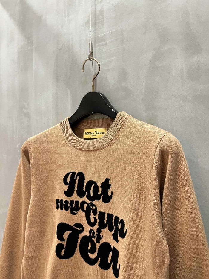 フロントに配された「IT’S NOT MY CUP OF TEA」のロゴは、インターシャ編みで表現され、あえて少し歪みのある文字にすることで、手仕事の温度感と遊び心をプラス。