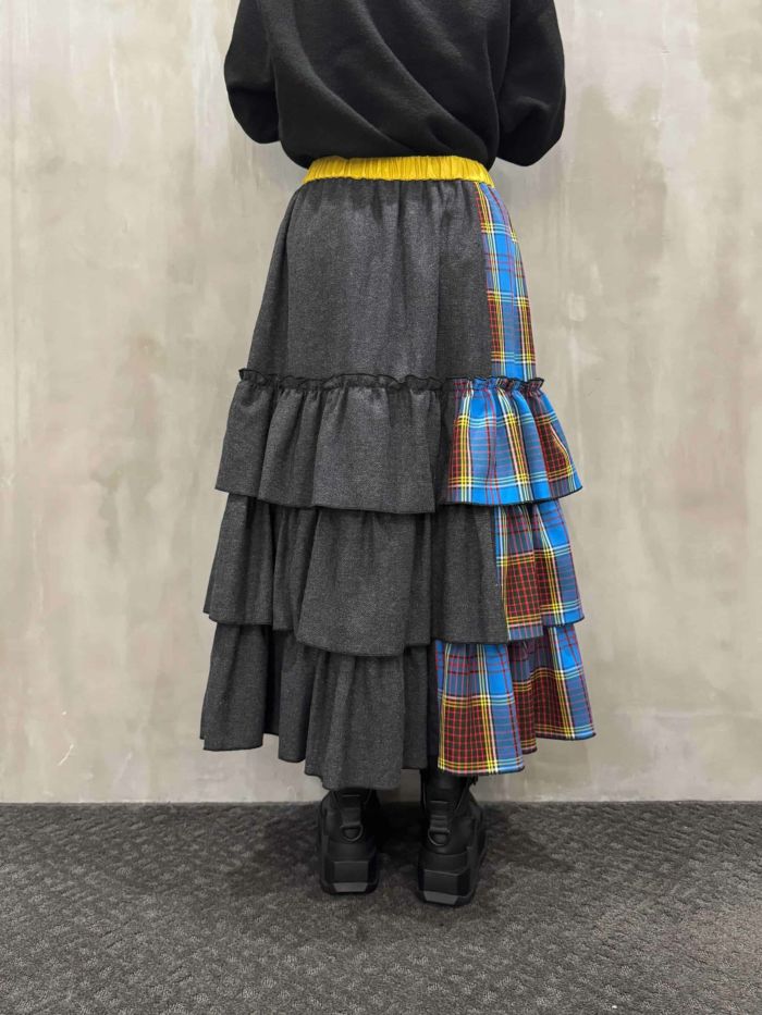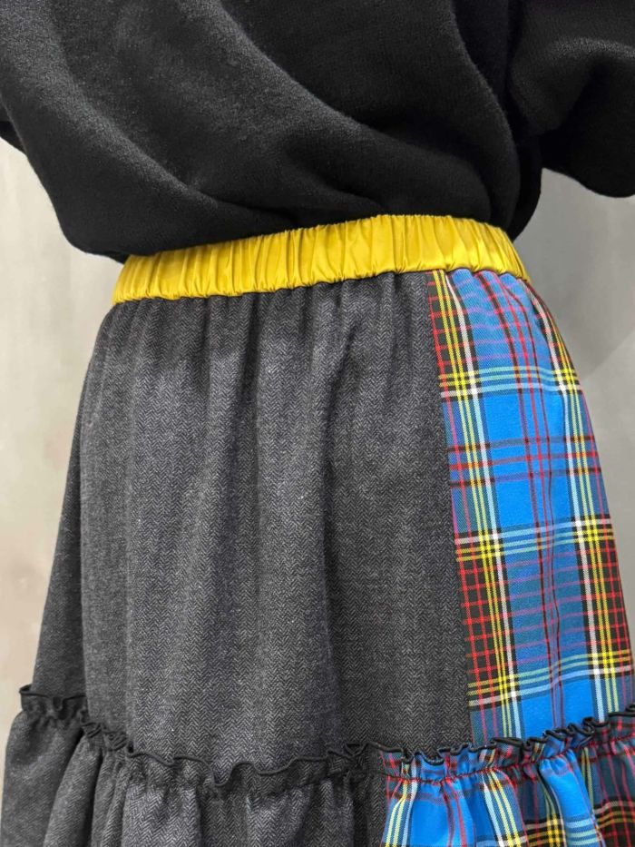ラッフルが3段に重なる冬用のスカートです。今回はグレーのスカートがメインビジュアルにもなっています。無地に見える部分はツイードで細かいヘリンボーン柄になっています。スカートの1/ 3 の部分はそれぞれチェックの生地に切り替えを作っています。ラッフルのボリュームを大きく出るようにしたデザイン。ウエストベルトも配色にしています。ウエストはゴム仕様で、両サイドポケット付き。着やすく便利です。