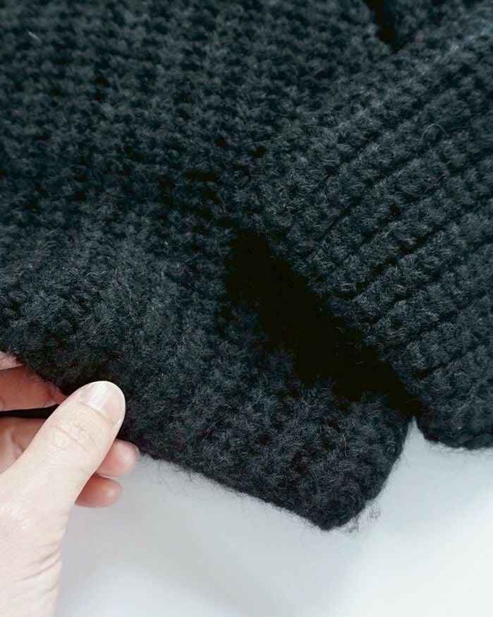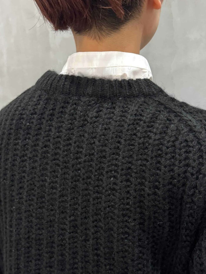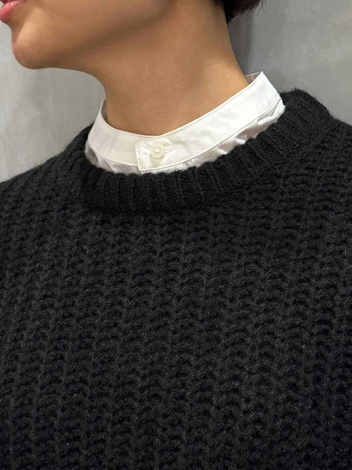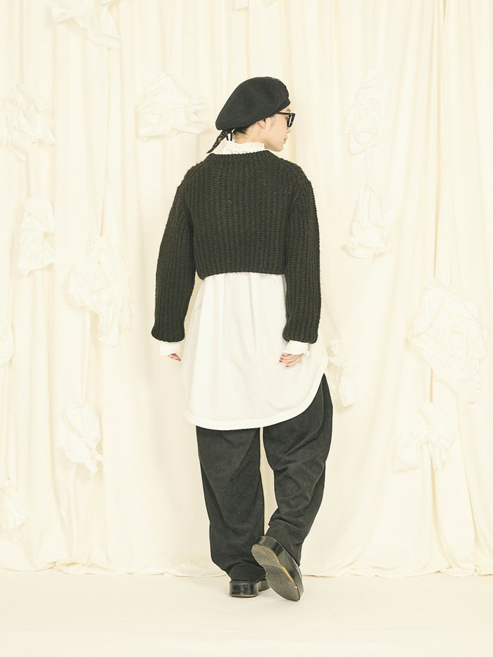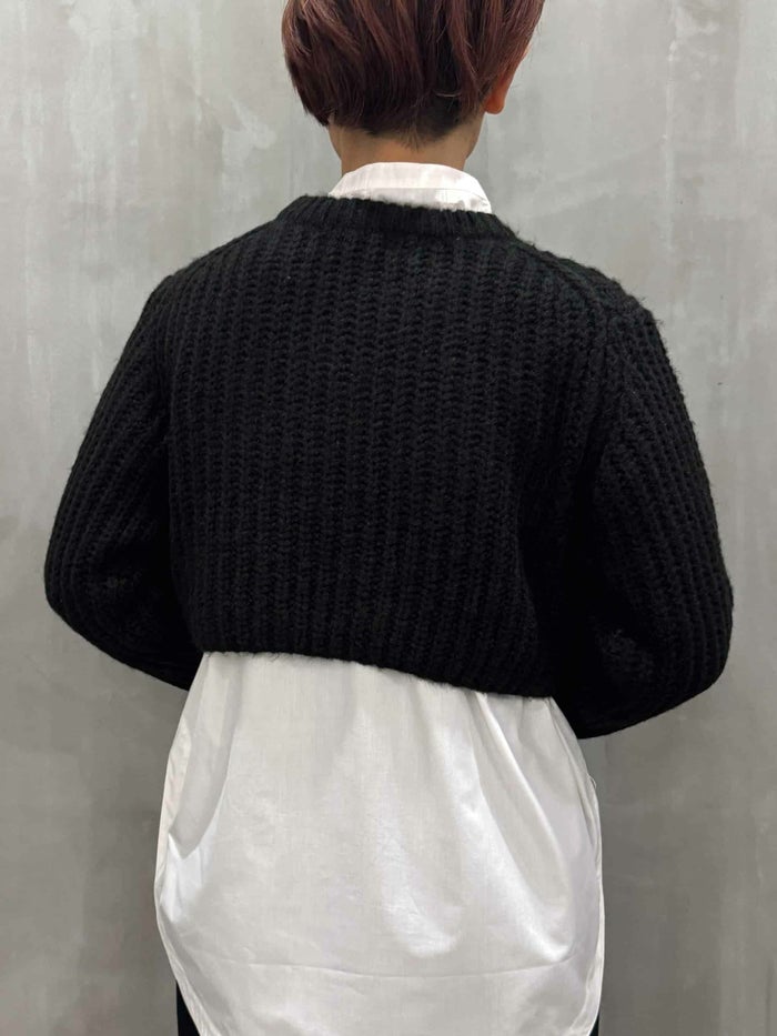 デザイナーである奥村展子氏の「着丈の長いシャツに合わせたくて」という想いから生まれた、ショート丈ニット。 アクリルウール×ナイロン混の軽やかな糸を使用し、細い糸を太めに1本取りして3ゲージでざっくり編み立てています。見た目は表情豊かでも、チクチク感が出にくいのが嬉しいポイント。