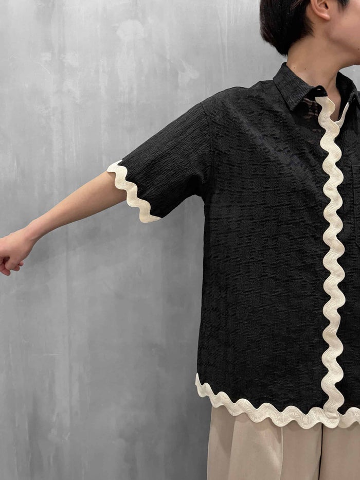 袖口と裾にウエーブしたテープを縫い付けて変化を付けました。フロントボタンはスナップで脱ぎ着しやすくなっています。ブラックは透け感があまりないので安心して着ることができました。陰影で出ているドットの柄も品良く、大好きなデザインになりました。