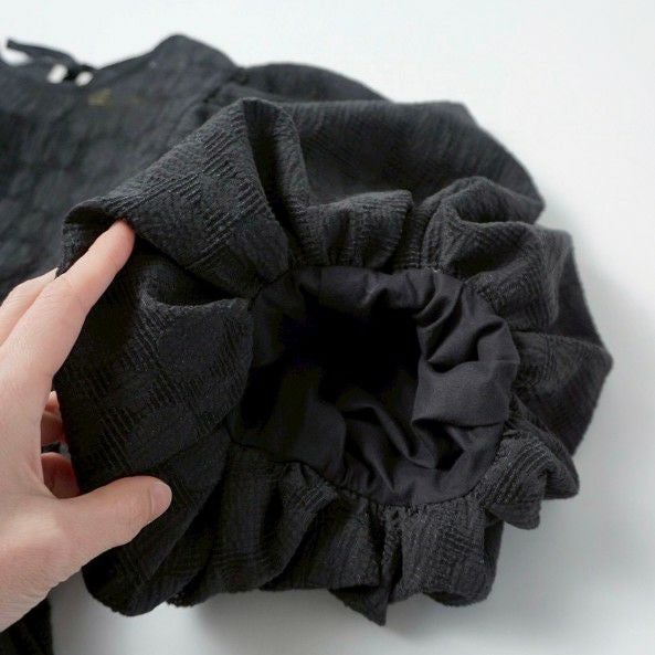 膨らみのでる少しだけハリのある素材でパフスリーブのパターンが良くできていて、きちんと膨らんでいます。袖の裏から裏地で生地を吊っているので袖口の圧迫感がなく着心地が良いのも特徴です。