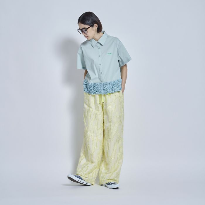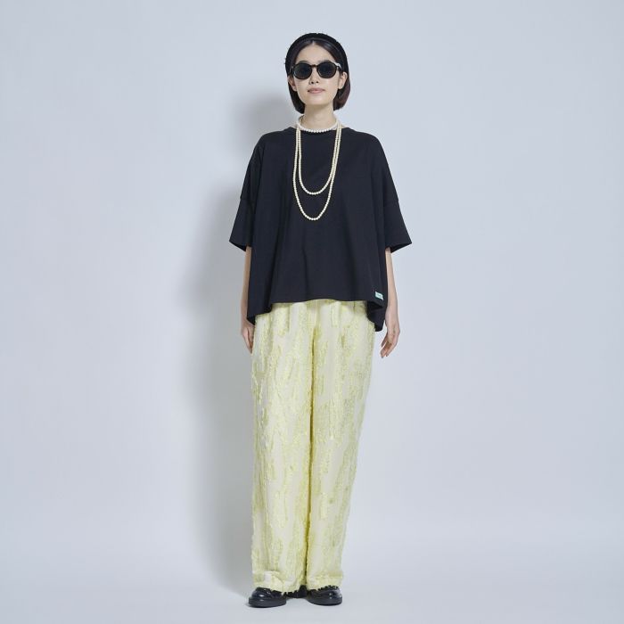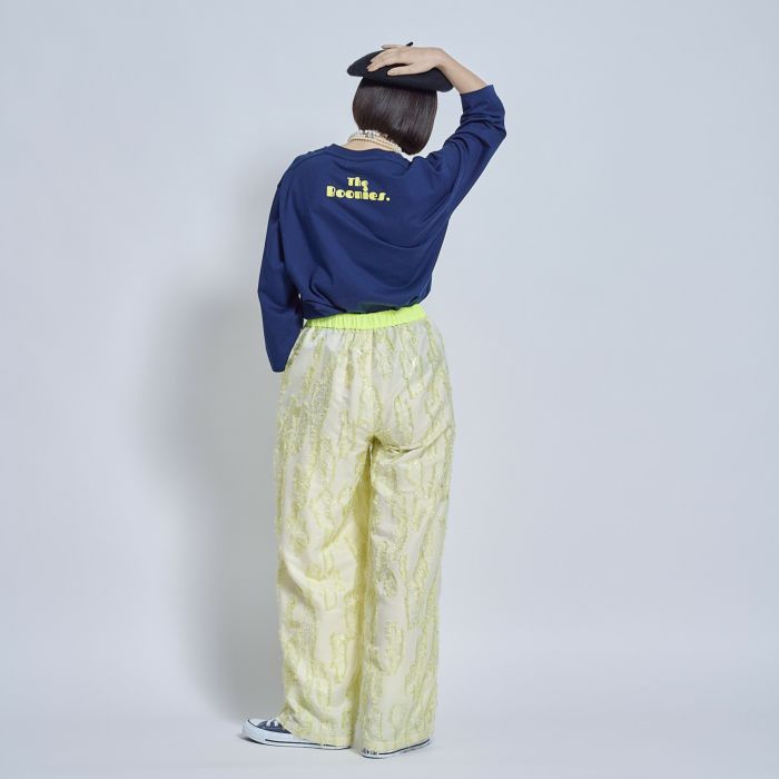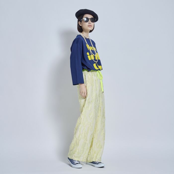 違和感のある糸の出方がとても可愛かったのでストレートのイージーパンツを作ってみました。ストンと落ちるオーバーサイズでウエストはゴム+ドローストリングの紐で締めることができます。細い方にもドローストリングの紐が付いているので、サイズ調節が可能で色々な体型の方に幅広くジャストフィットします。特にサイズを気にされるグラマラスな体型の方にはとても向いています。