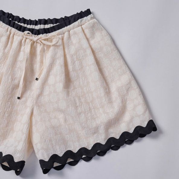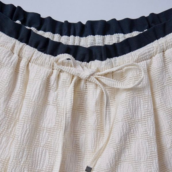 スタッフ人気No.1のショートパンツです。少し透けるドット透かしのジャガードのドライタッチなテキスタイルで作っています。今回は丈長めの膝上、広がりを沢山つけて、足がほっそりと見えるようにデザインしています。ここまで裾の広がりがあるショートパンツはなかなかないと思います。ヒップが大きい方にも安心して着用できます。夏のショーツに抵抗ない方が増え、流行から定番へと人気が継続していますが、足が細く見える広がりが大きな特徴になっています。また、ヘムにウエーブテープをつけているのでヘムに厚みがありさらに広がりが出るようになっています。ヒップも大きめ、ワタリも大きめ、細い方は、ウエストのインナードローストリングで絞って履いてください。イージータイプで履く方の体型を選ばない作りになっています。