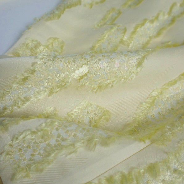 今回は薄い蛍光のようなジャガード織の雰囲気あるカットジャガード素材。織りで目を飛ばして、糸を出し、出た糸をカットしてリーフ柄を表現しているテキスタイルを使いました。