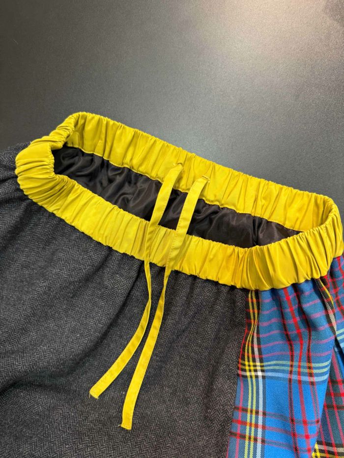 ラッフルが3段に重なる冬用のスカートです。今回はグレーのスカートがメインビジュアルにもなっています。無地に見える部分はツイードで細かいヘリンボーン柄になっています。スカートの1/ 3 の部分はそれぞれチェックの生地に切り替えを作っています。ラッフルのボリュームを大きく出るようにしたデザイン。ウエストベルトも配色にしています。ウエストはゴム仕様で、両サイドポケット付き。着やすく便利です。