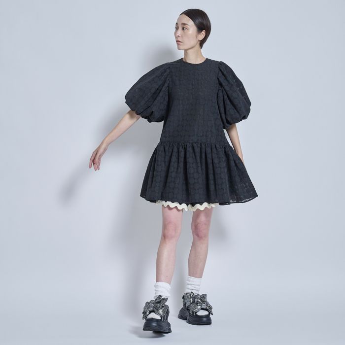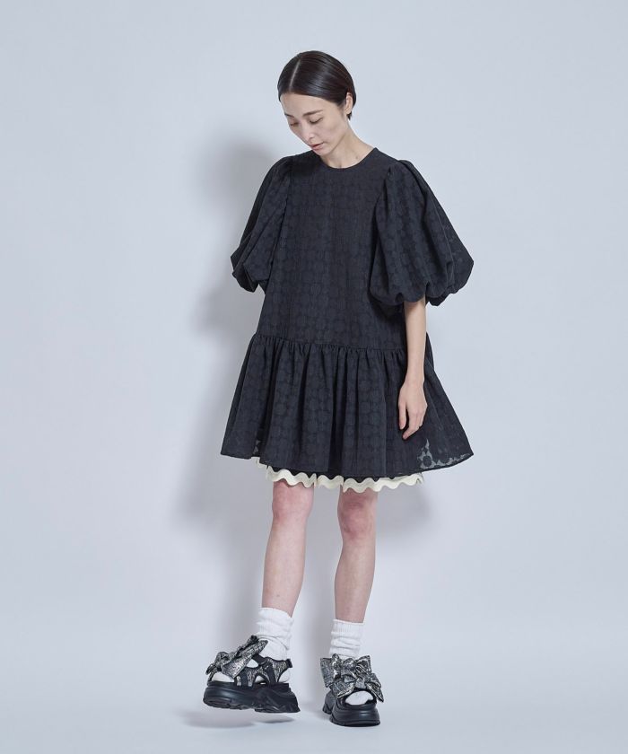身頃は大きめで、ワンサイズ。どんな体型の方でも着ることができます。ミニ丈で、膝上になります。一枚でも、チュニックとしての重ね着でも活用できます。冬はインナーに薄手のニットなどを着て、タイツでもOKです。シアー素材、ドット柄のジャガード素材ですが、夏ばかりではなくオールシーズン着るのも良いと思います。インナーに同系色の長袖を入れると、ちょっとしたお食事のお席や、パーティーなどにも向いていると思います。