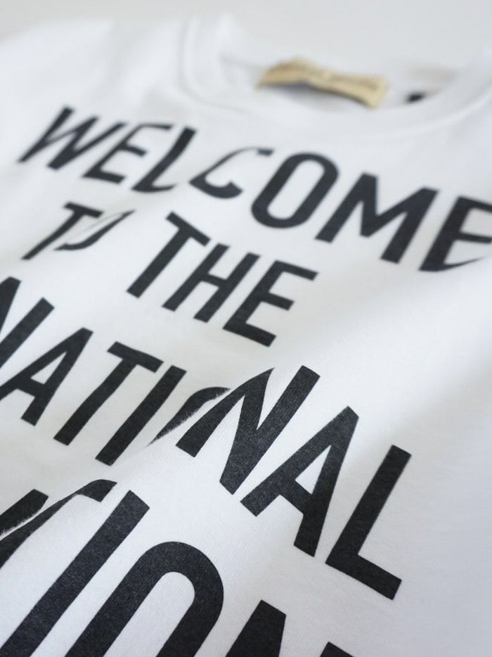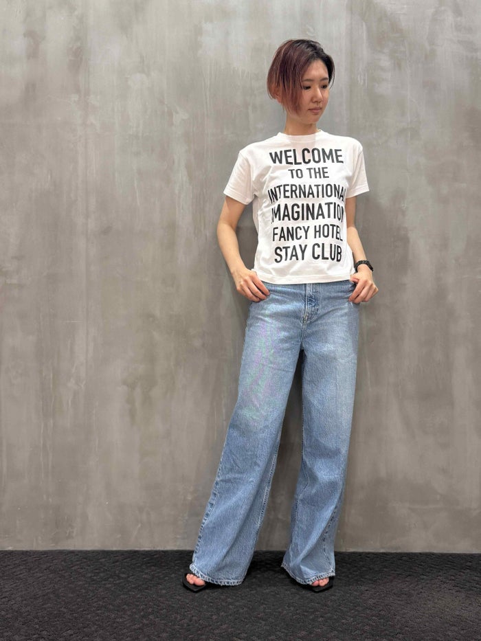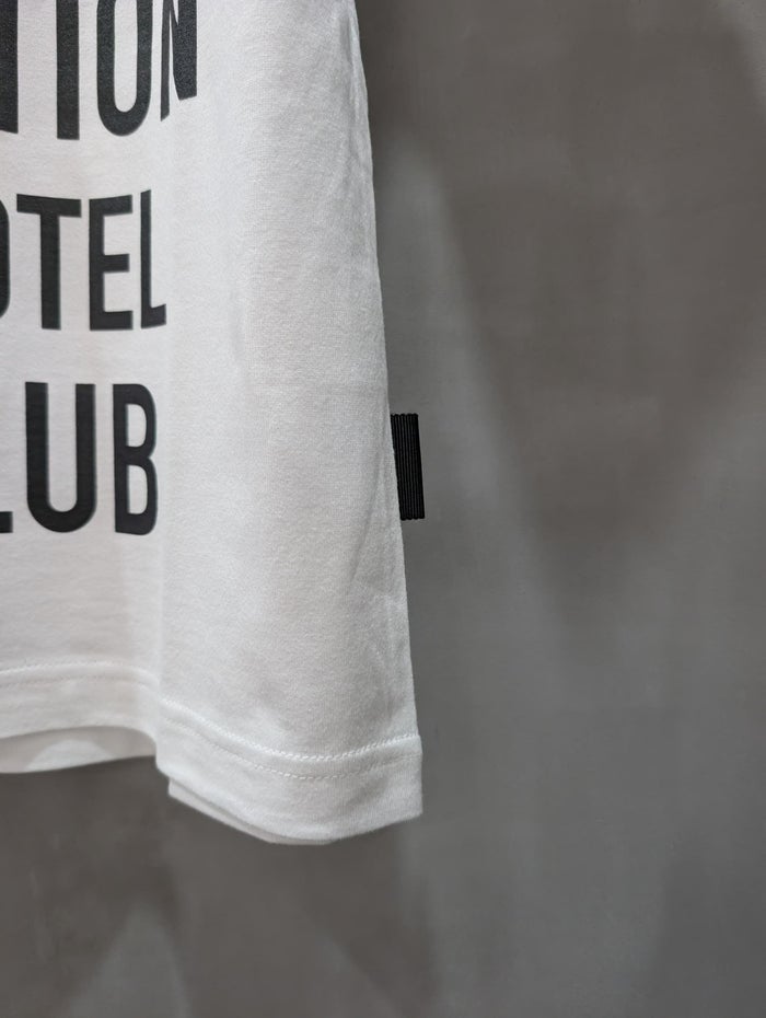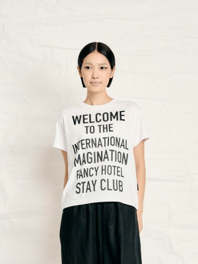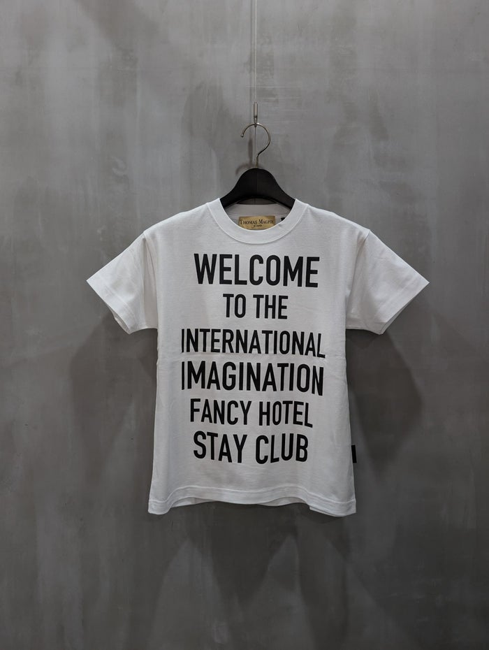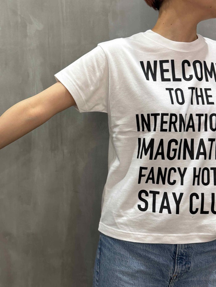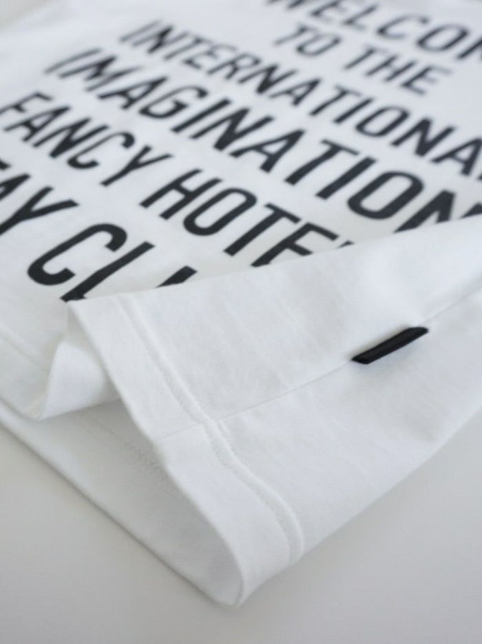 「WELCOME TO THE INTERNATIONAL IMAGINATION FANCY STAY HOTEL CLUB(ようこそ 国際的高級ホテル滞在・妄想クラブ)」という遊び心あるロゴが印象的なTシャツ。