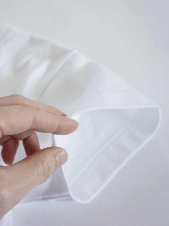 身頃はやや大きめ、袖と着丈を短めにしたオリジナルボディで、体のラインを拾いにくく、自然にバランスよく着られるサイズ感です。