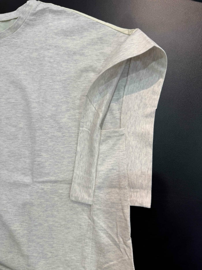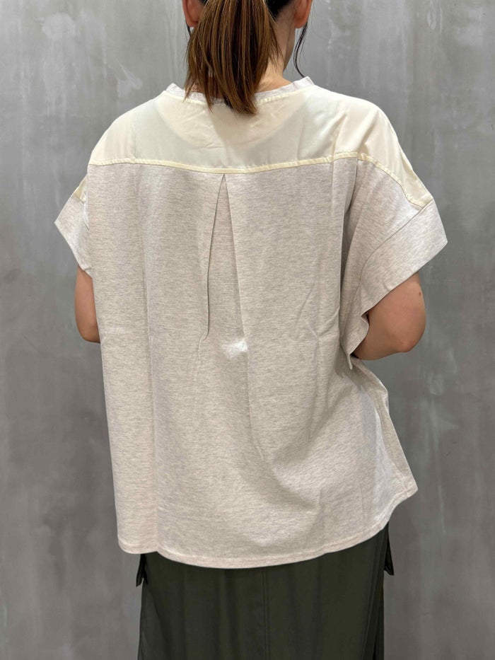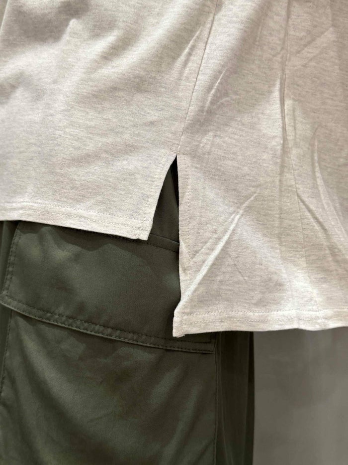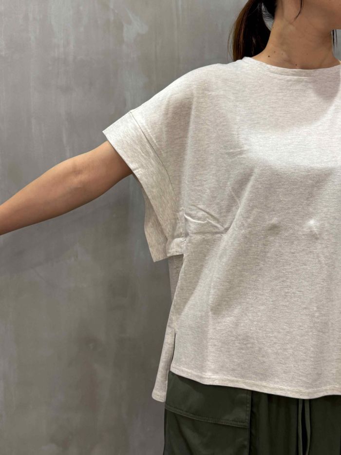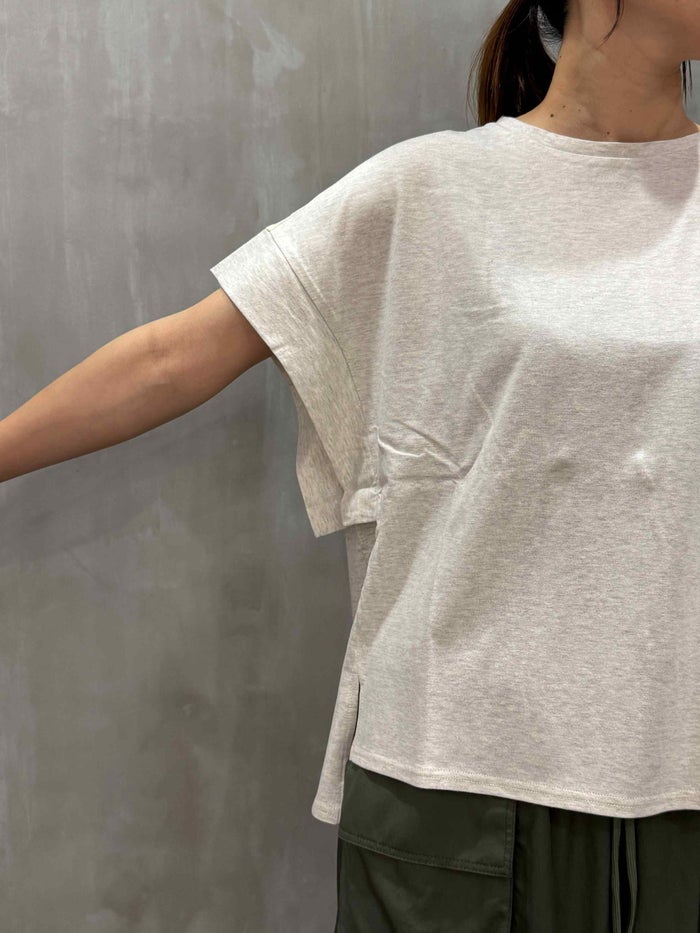 ゆるっと着られるボクシーシルエットと、抜け感たっぷりのドロップショルダーデザインが魅力。袖口はやや大きめに設計されており、リラックス感あるシルエットが自然な体型カバーにもつながります。