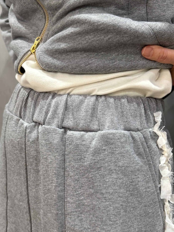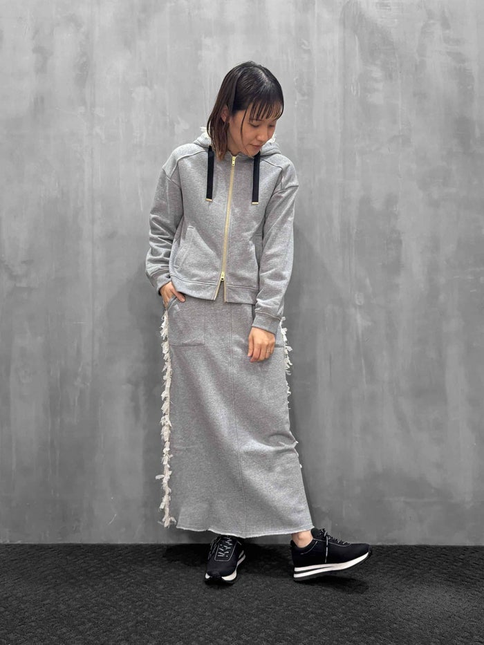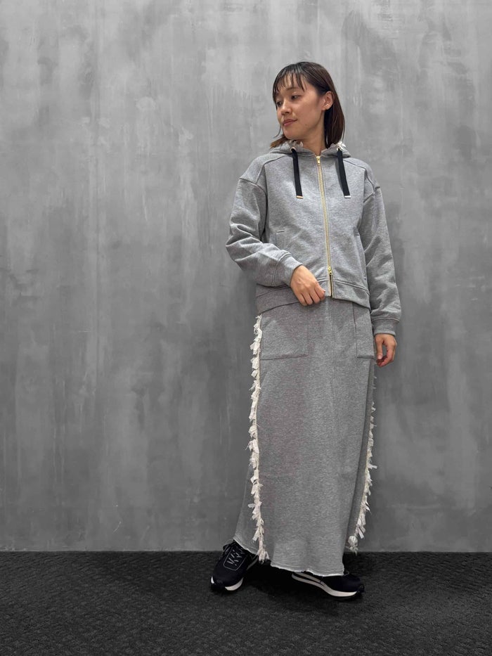 薄手のコットン裏毛ロングスカートのサイドにフリンジレースを施し、デザイン性抜群ながら気軽に履きやすいカジュアルな1枚。