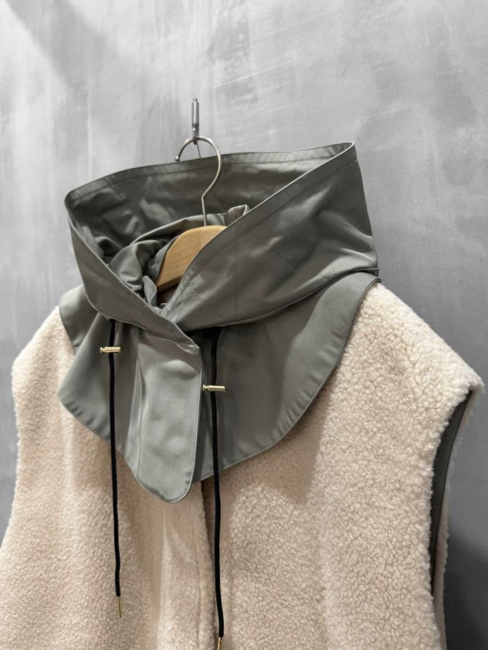 軽く温かいボアを使用したオーバーサイズのハーフジレ。 異素材のフードは締めると襟のようなデザイン。 フードをとってシンプルにも着れる1枚。