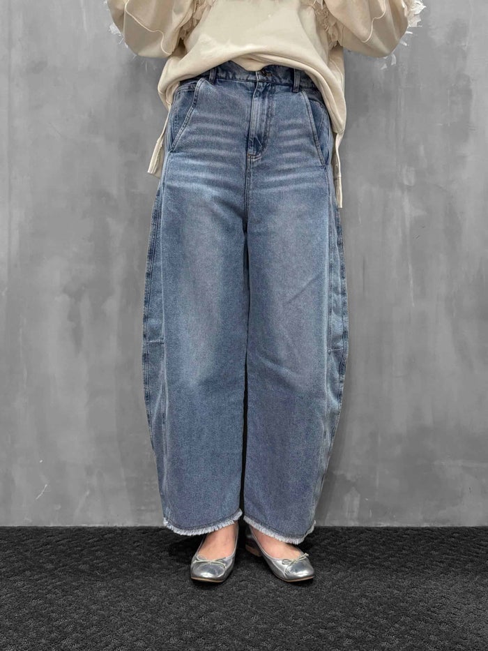 8.5ozのデニムにダメージ加工を施し軽くて柔らかな着心地のバレルパンツです。