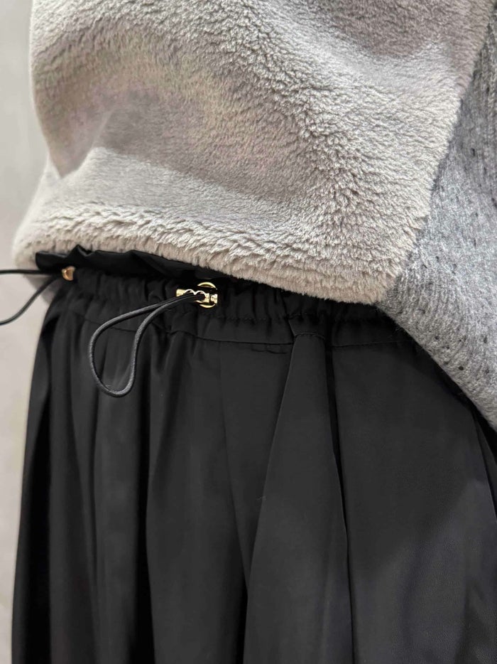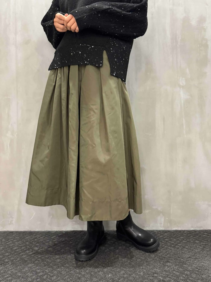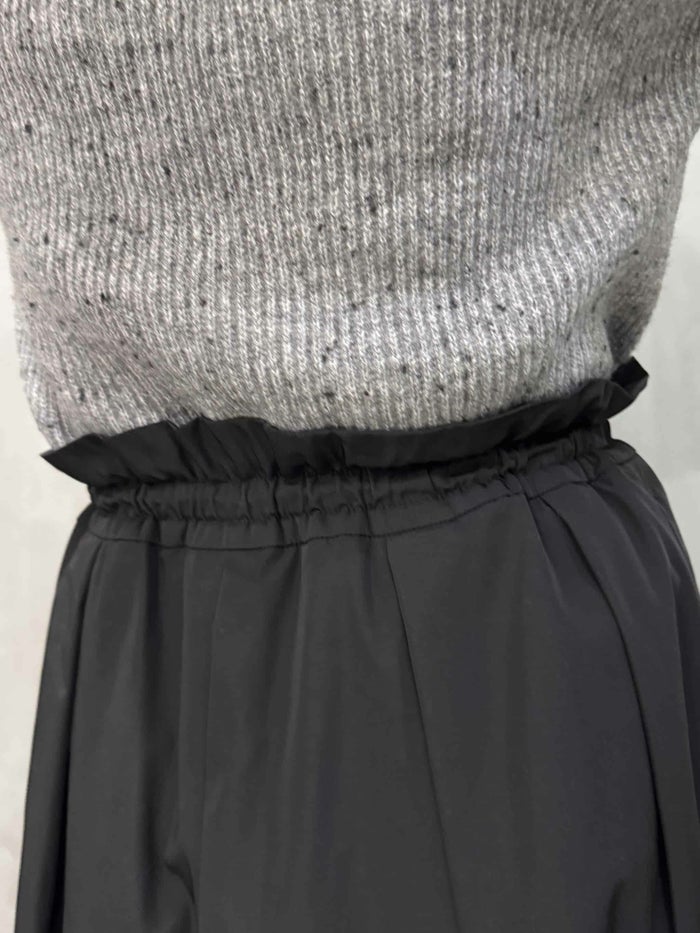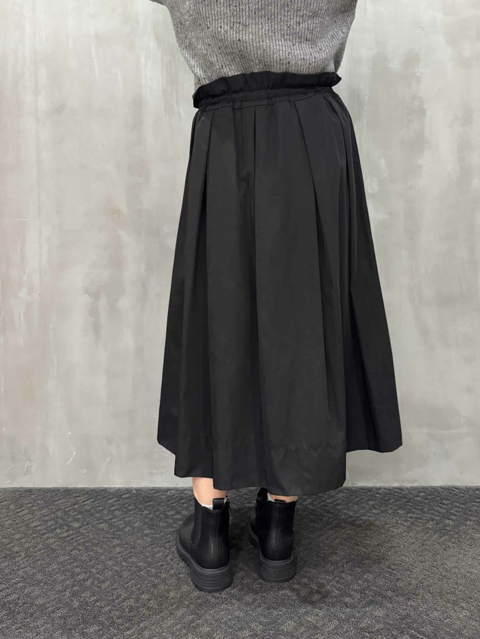 ウエストはゴム仕様のリラックス感のある穿き心地で、フロントのドロストでサイズ調整が可能。ギャザーとタックが生み出す、裾にかけてふんわりとしたシルエットが女性らしく、動くたびに優雅に揺れます。ニットやスウェットと合わせてカジュアルに、ブラウスやジャケットと合わせてきれいめにも着こなせる万能アイテムです。