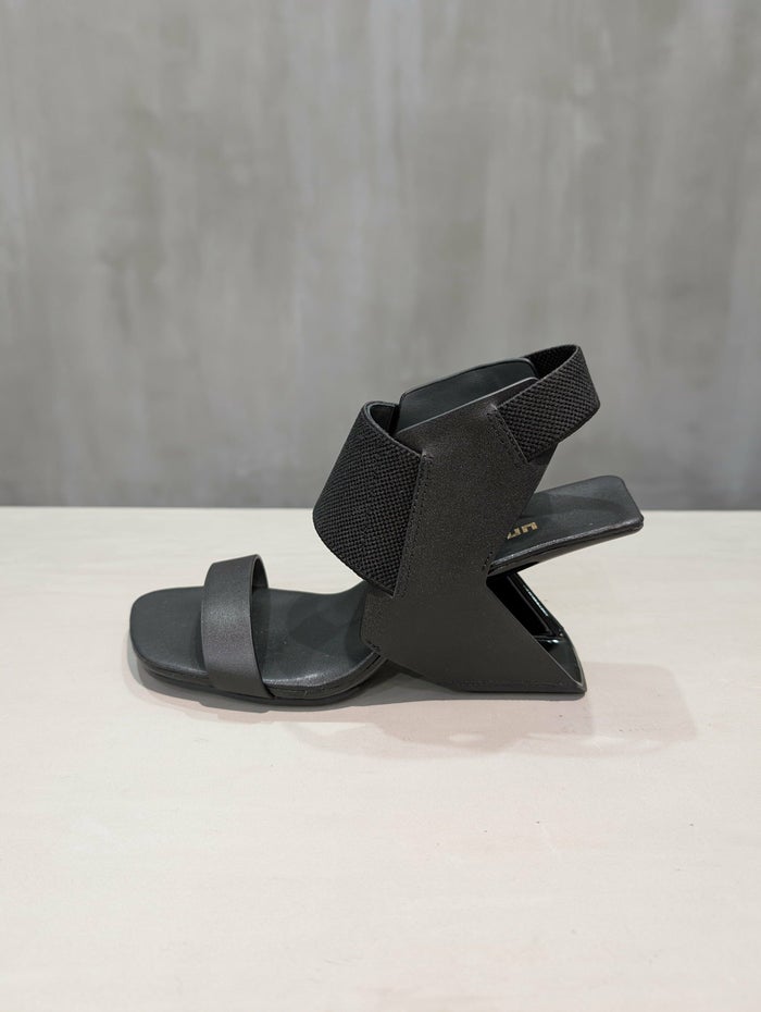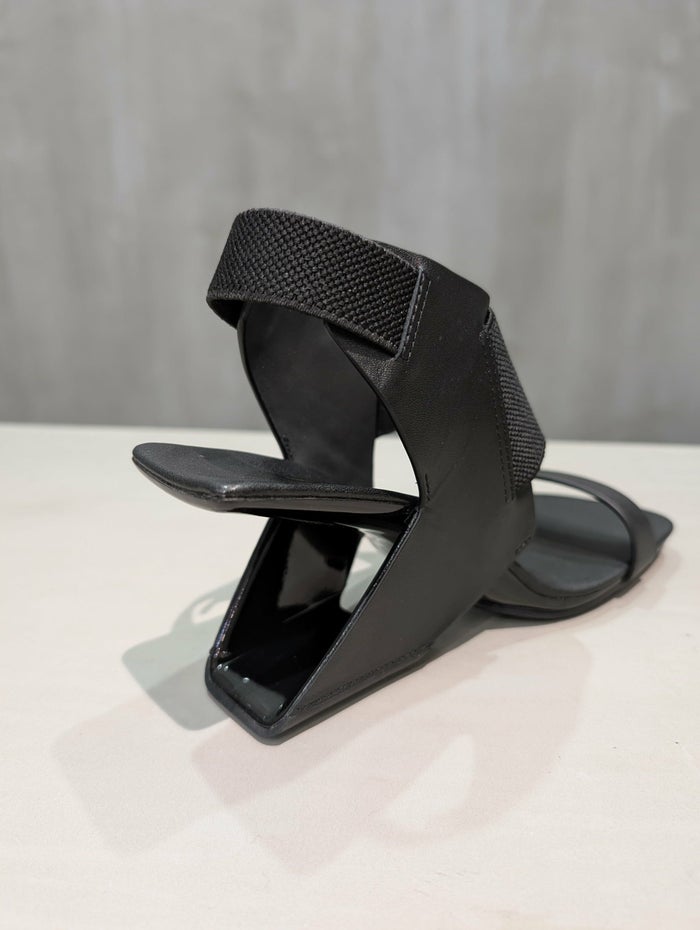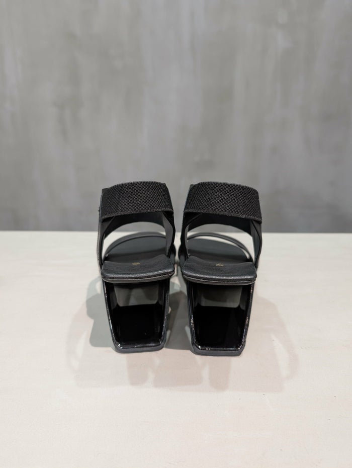 踵が浮いているようなデザインのヒールは強化繊維で作られており軽量で丈夫な作り。 デザイン性と安定性を兼ね備えた構築的なヒールが人気の一足。 爪先のベルトはゆったり目の履き心地となっており幅広な足にもフィット。 今シーズンは、伸縮性のある甲と踵のベルトで、フォールド感抜群のデザインへアップデート。