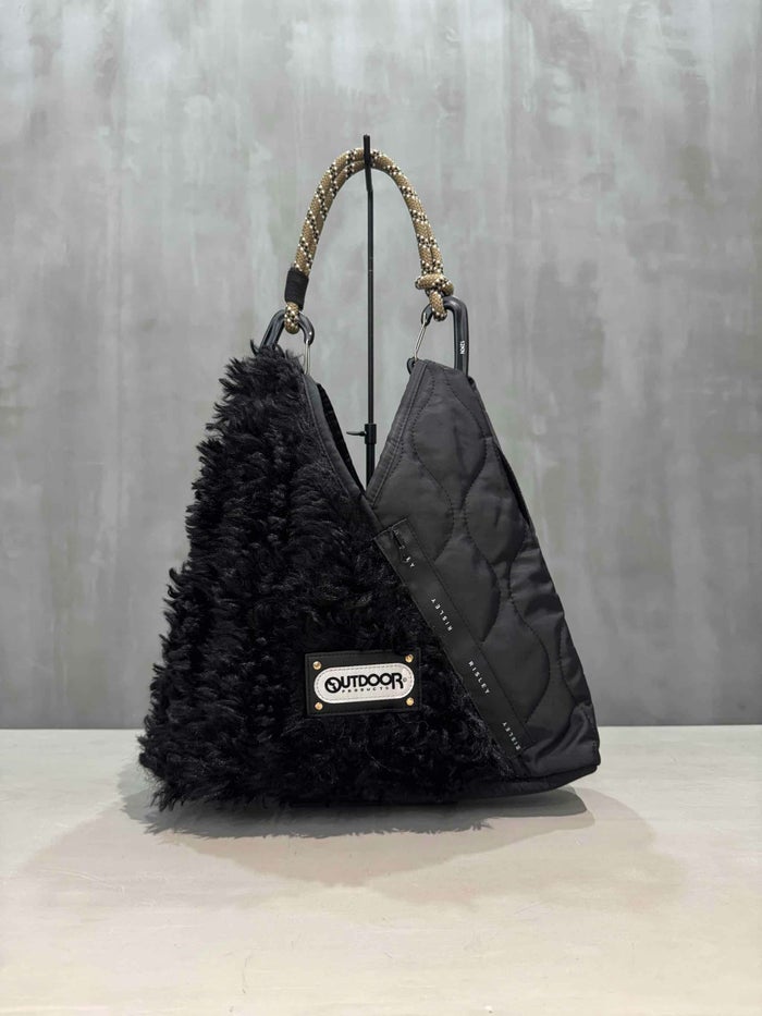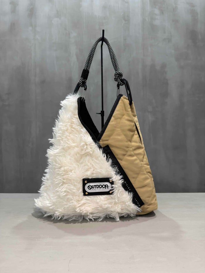 当サイトでも毎回人気のトライアングルバッグ。ふんわりとしたファーとキルティング素材を組み合わせたトレンド感あふれるミニバッグです。三角形のユニークなフォルムがスタイリングのアクセントになり、持つだけでシーズンムードを高めてくれるアイテムです。
