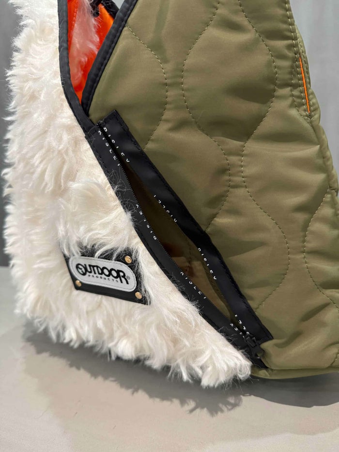ファー部分と軽量で柔らかなキルティング素材を組み合わせ、見た目の可愛さだけでなく実用性も兼ね備えた仕上がり。内側には裏地を施し、小物の出し入れがスムーズ。ハンドル部分には合成皮革を使用し、高級感と耐久性をプラスしています。
