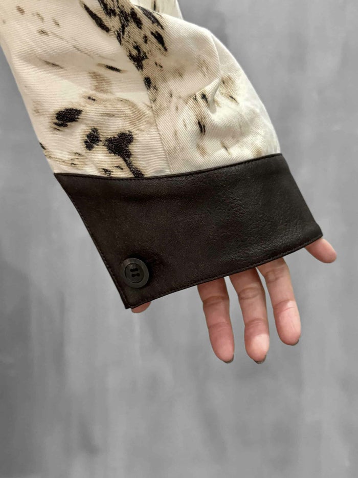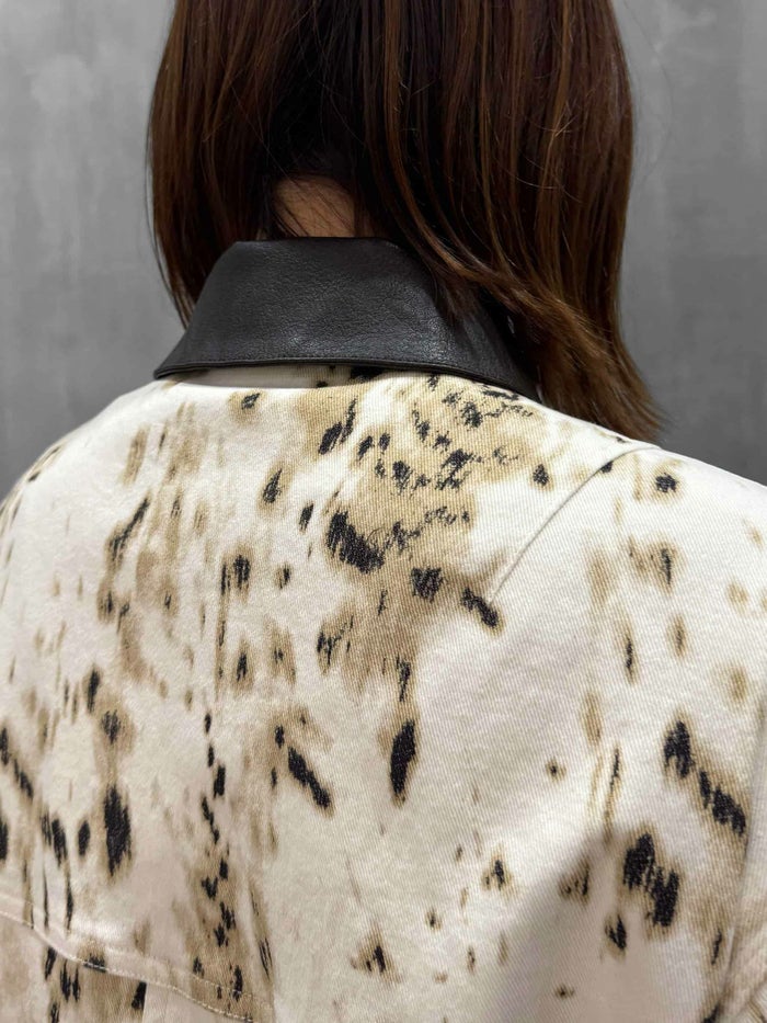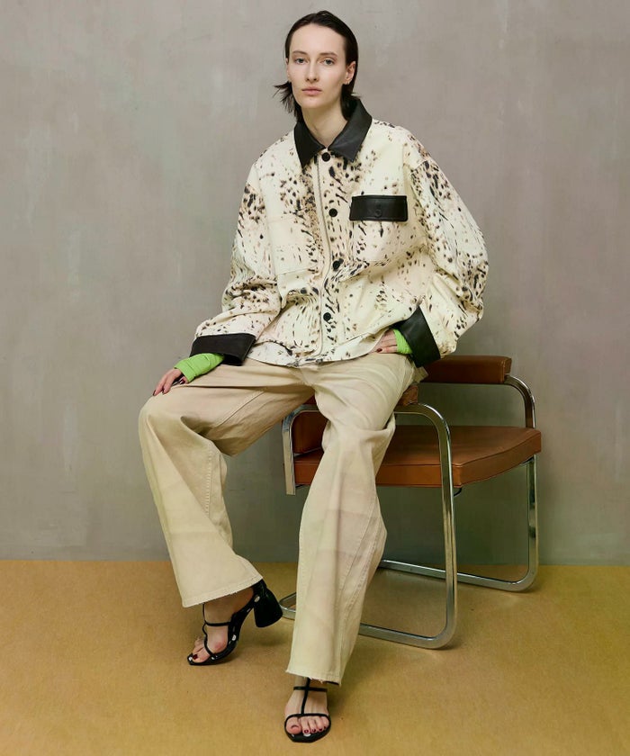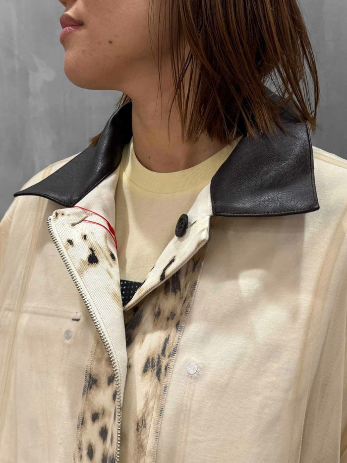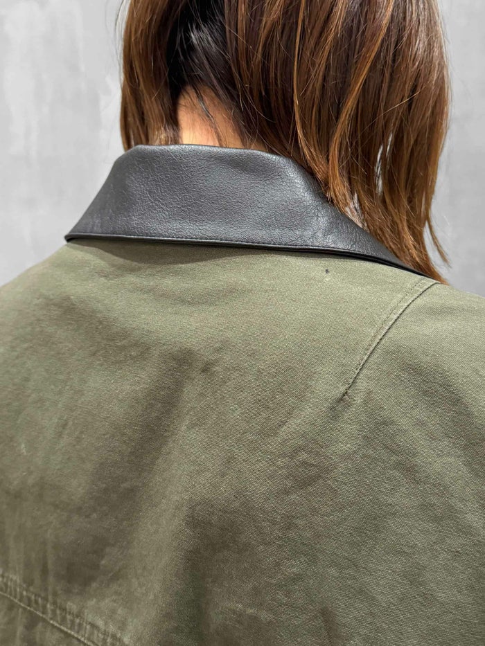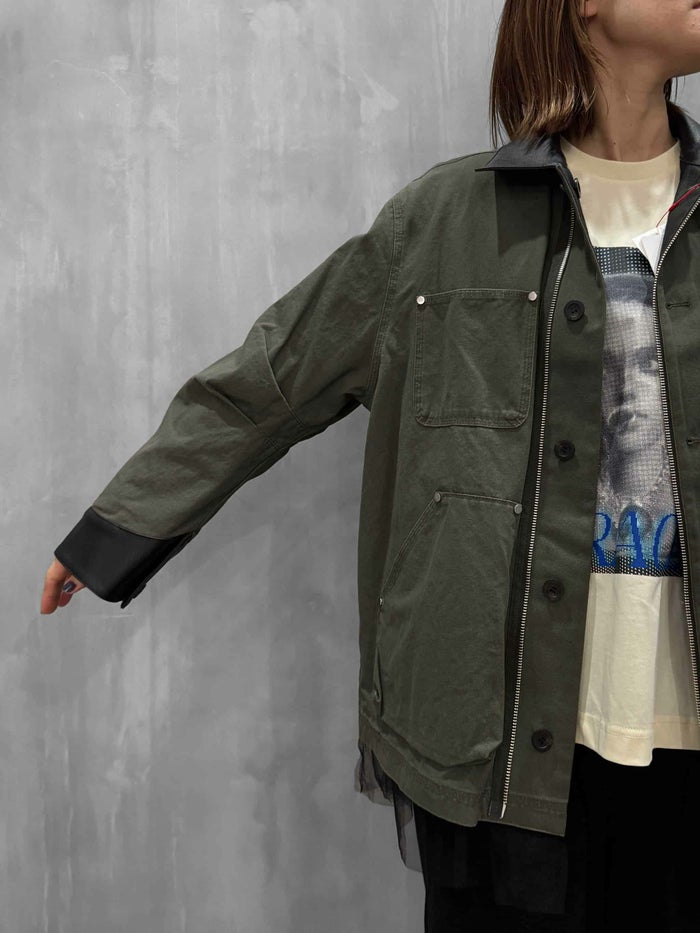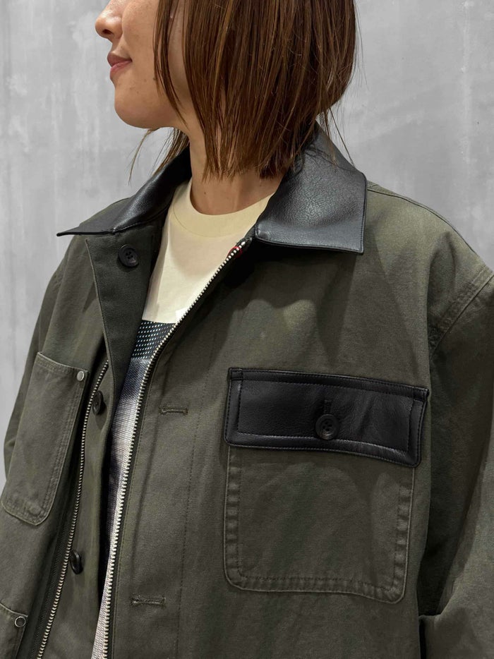 襟やポケットに施されたレザー調の切り替えが全体を引き締めるアクセントに。
