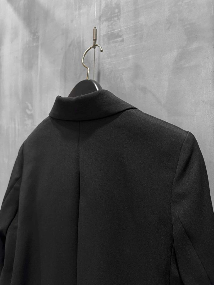 ダブルの打ち合わせでボックスシルエットでありながらも、ボタンを留めることですっきりとレディライクな印象に。
