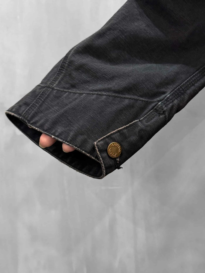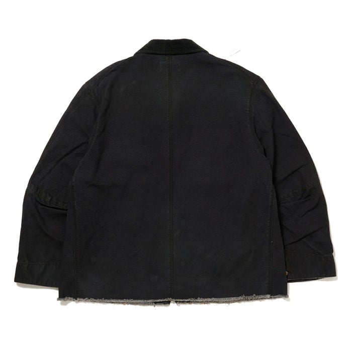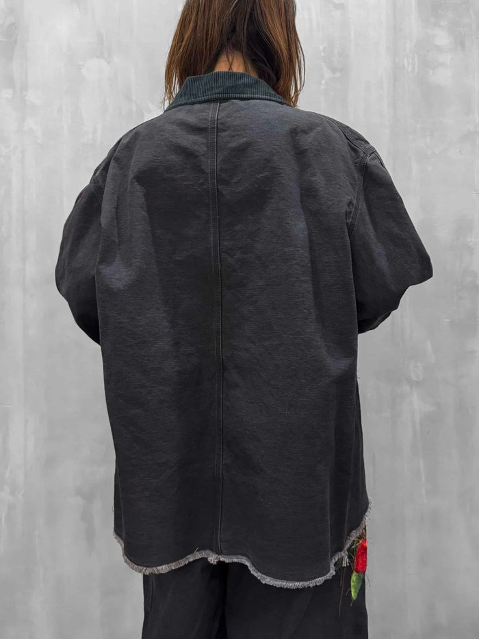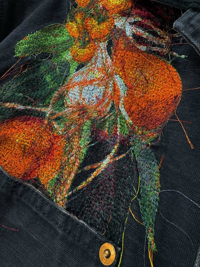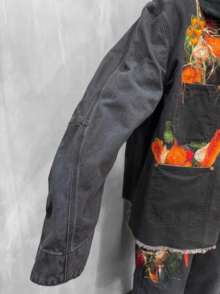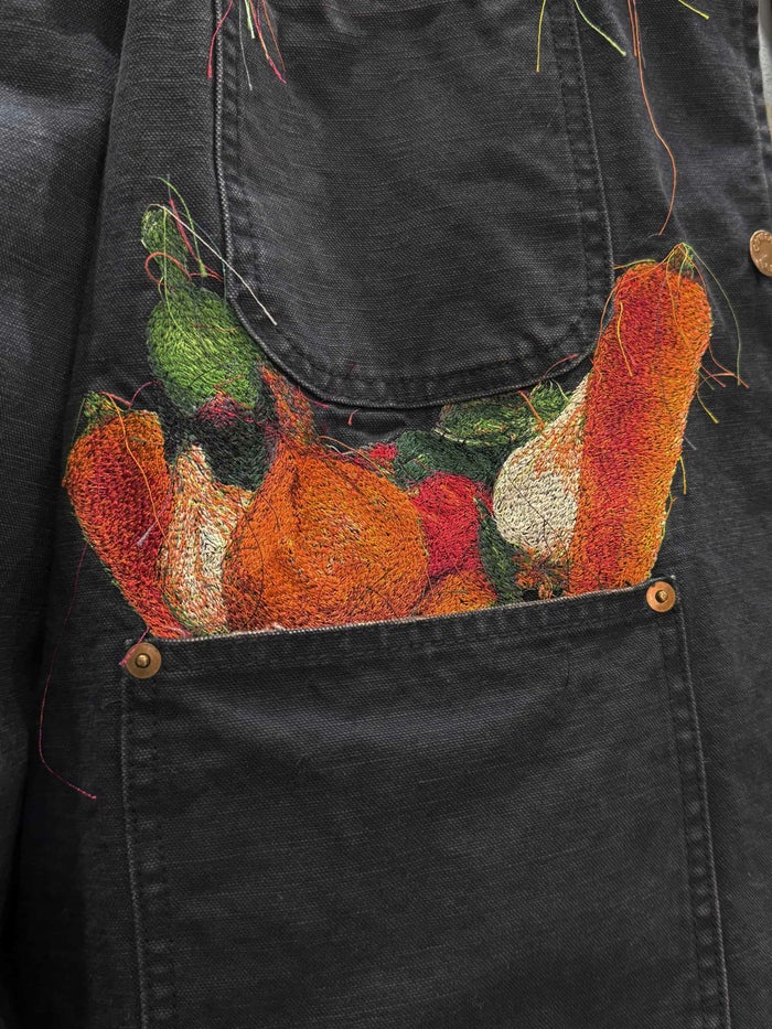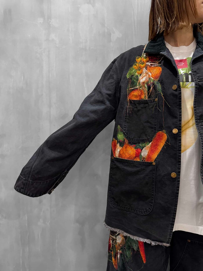 A WORK JACKET MADE FROM GARMENT-DYED AND WASHED DUCK FABRIC, FEATURING REALISTIC EMBROIDERY OF ONIONS, CARROTS, BELL PEPPERS, GARLIC, RED CHILI PEPPERS, AND EGGPLANTS. THE RUGGED SILHOUETTE RESEMBLES VINTAGE UTILITY WEAR, CONTRASTED BY THE COLORFUL VEGETABLES OVERFLOWING FROM THE POCKETS.