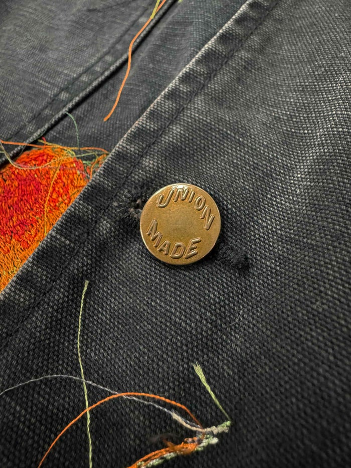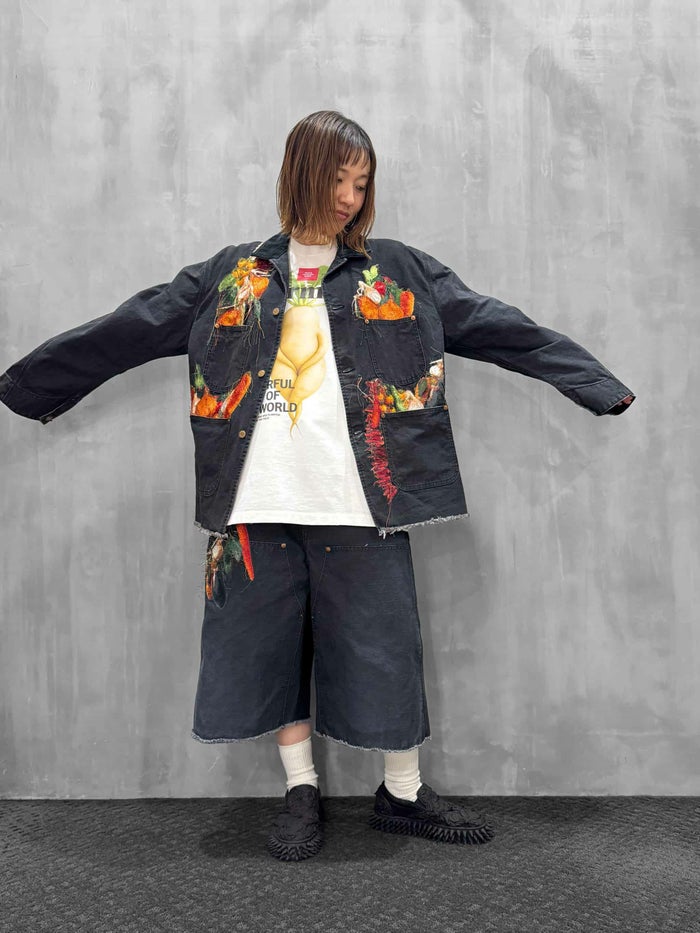 製品染めと洗いをかけたダック生地に、玉ねぎ、人参、ピーマン、にんにく、赤唐辛子、茄子などの野菜をリアルな刺繍で施したワークジャケット。ヴィンテージの作業着のような無骨なシルエットと、あふれ出しそうな野菜たちの鮮やかさが対比を生んでいます。