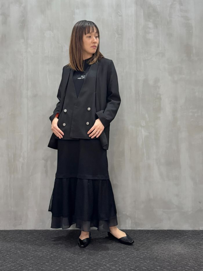 クラシックなテーラードカラーと、肩から流れるようなドッキングデザインが印象的で、シンプルなトップスやボトムスに羽織るだけでスタイリングが決まります。モードな空気感を持ちながら、オン・オフ問わず活躍する一着。