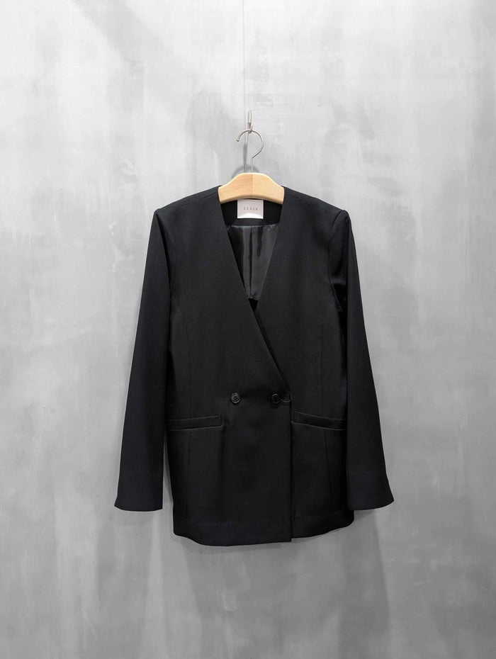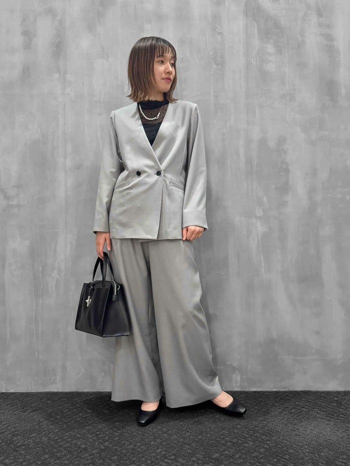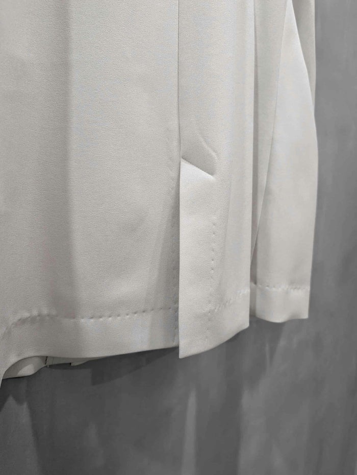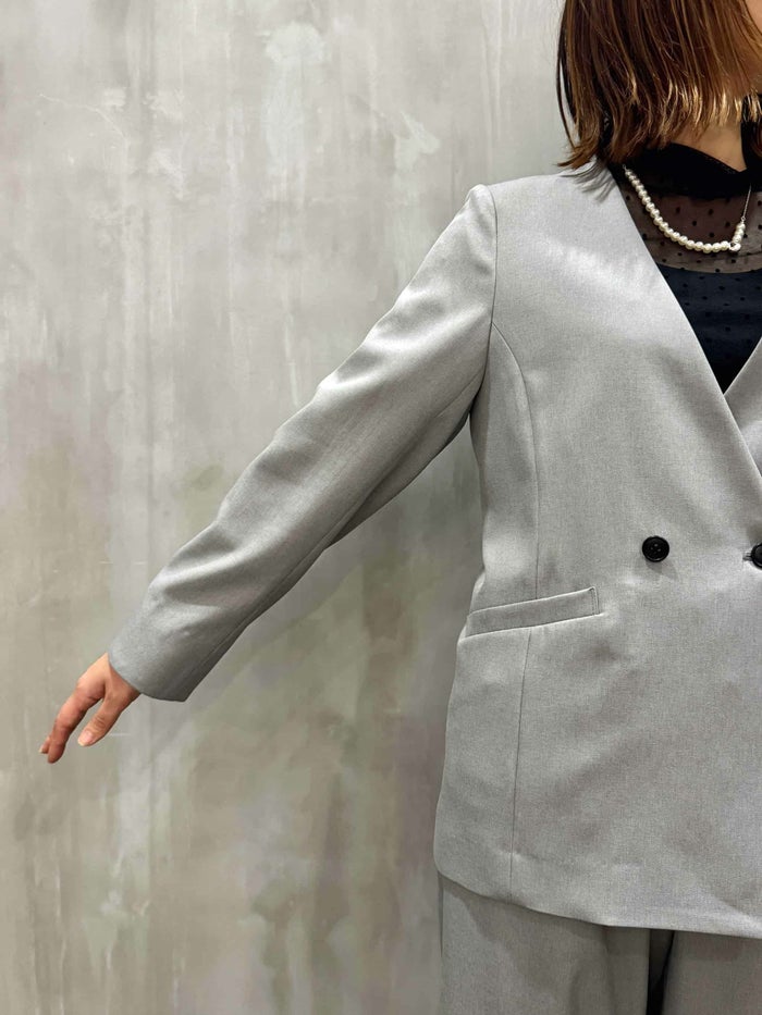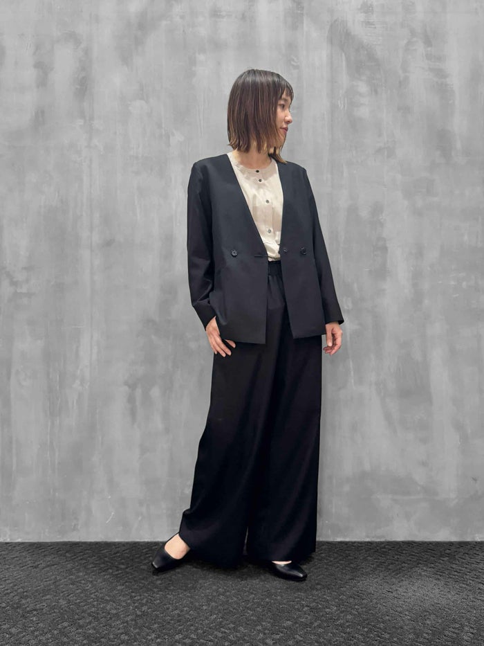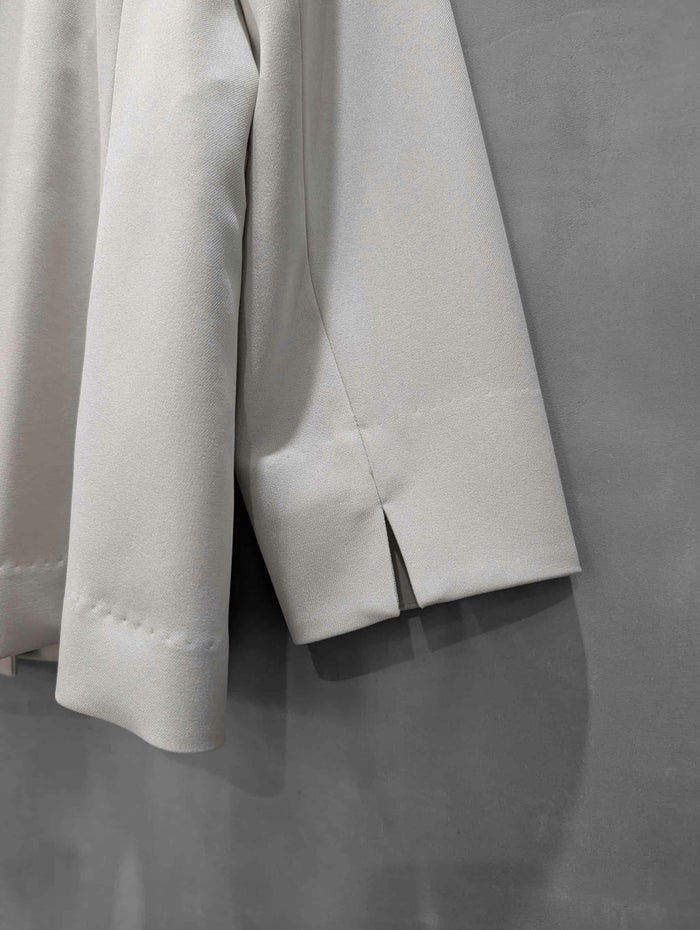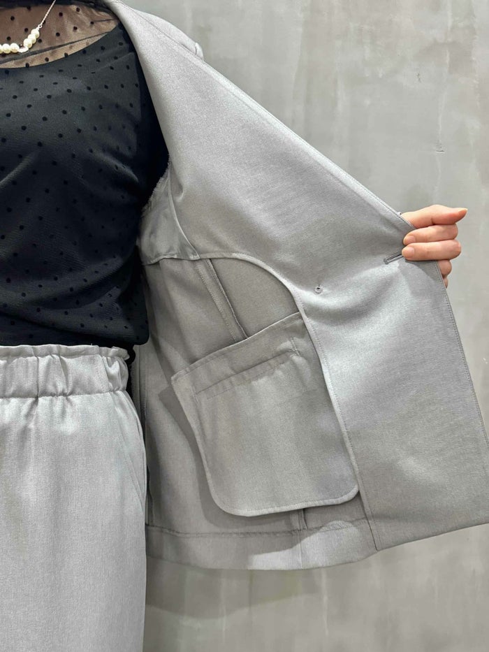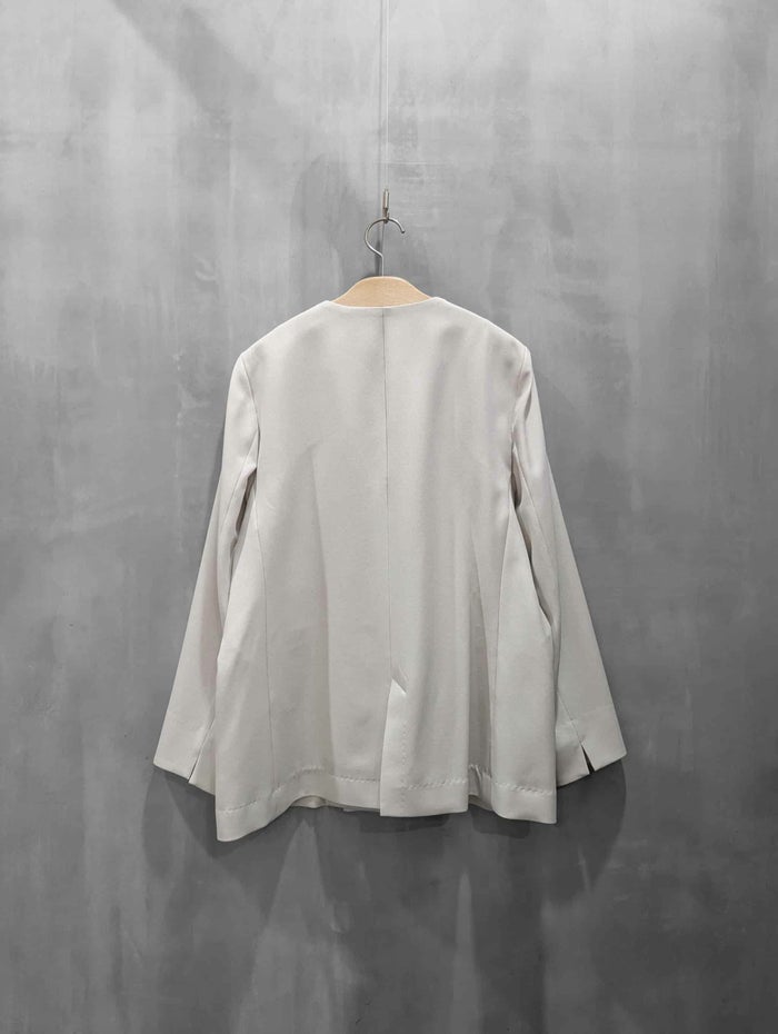 程よい落ち感とソフトな風合いが特徴。吸汗性、速乾性、ストレッチ性と多機能素材です。すっきりとしたノーカラーデザインが上品な印象を与え、オンスタイルはもちろん、カジュアルなボトムスとも相性良く合わせていただけます。程よくゆとりのあるシルエットで、セットアップとしても単品使いとしても活躍する一着です。
