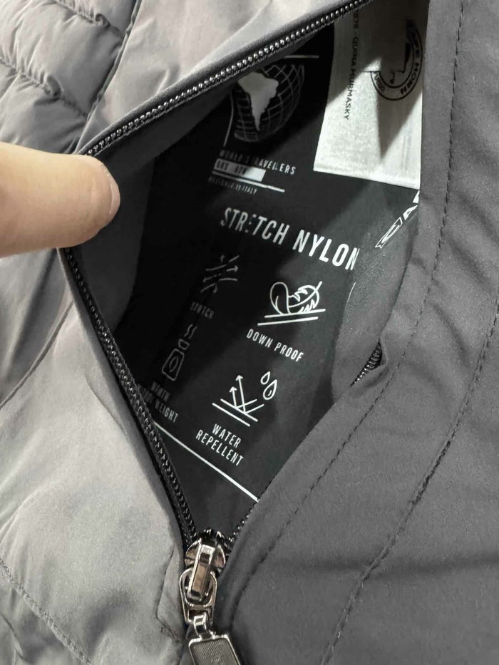飛び出してしまったダウンは引っ張らず、内側から引き戻すか表地を軽くつまんで押し戻してください。