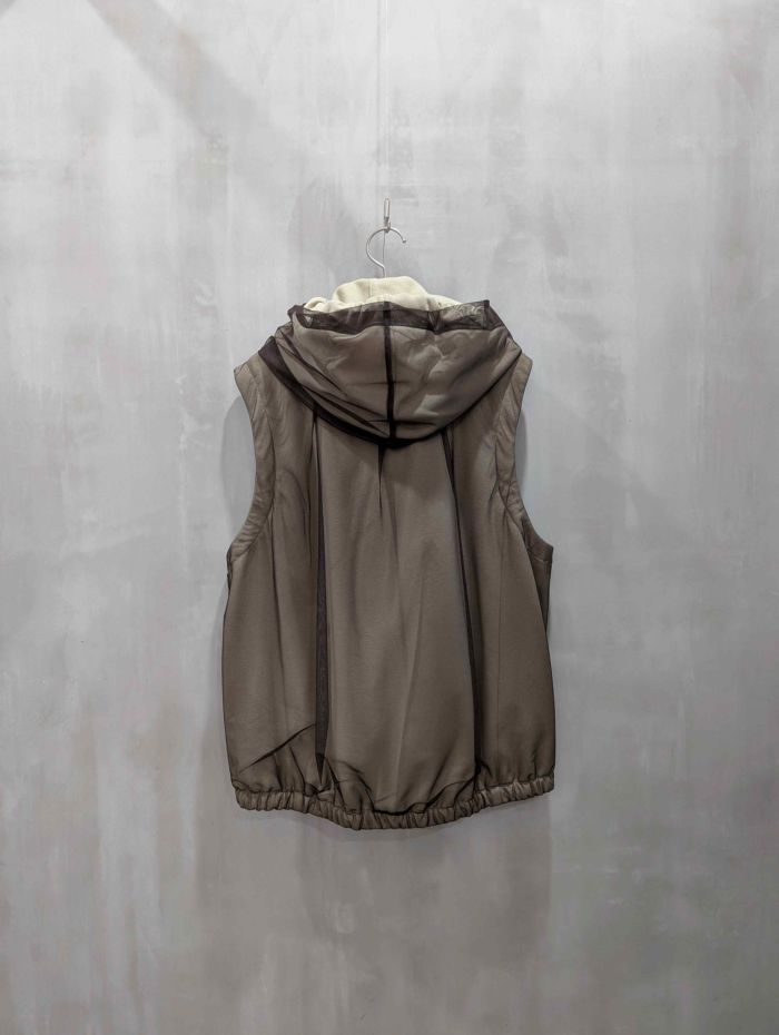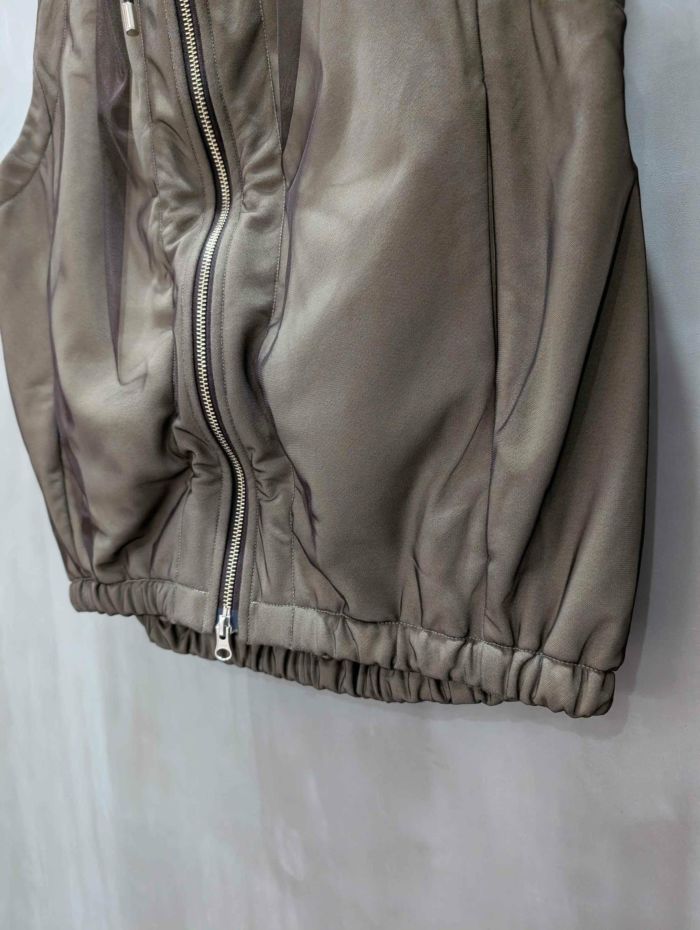 装いをクラスアップさせるデザインジップアップパーカー。内側はふんわりとした起毛素材であたたかく、気温の変化が激しい晩夏初秋に最適な調温アイテムです。冬季にはコートの下にライナー代わりに着用でき、ロングシーズン楽しめます。ベスト型ならではの動きやすさや、重ね着のしやすさが魅力でバルーンスリーブなどの袖にポイントがあるアイテムと好相性です。フロントはダブルジップファスナー仕様で、着こなしのアレンジ自在。ファスナー横にドローストリングが施さされておりギャザーを寄せて楽しむ遊び心溢れる一着です。