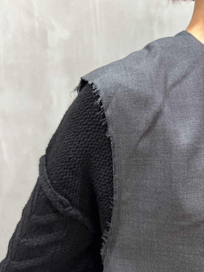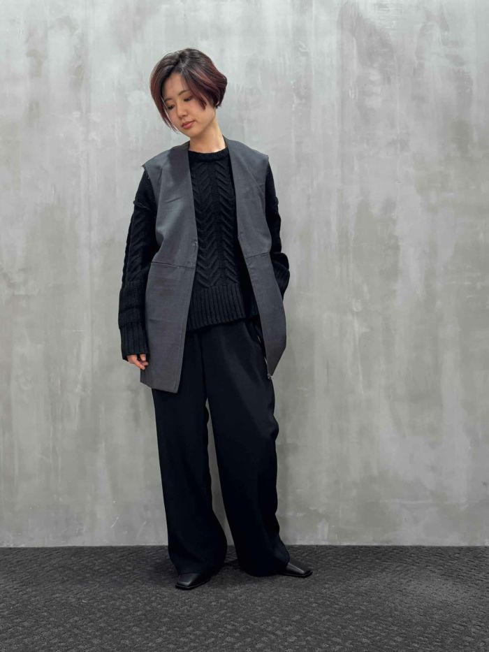 上質なウール100%素材を贅沢に使用した、洗練された印象のノースリーブベスト。薄手ながらしなやかなハリと美しいドレープ感を備え、オールシーズン活躍するアイテムです。袖口は断ち切り仕様で、さりげない抜け感をプラス。フロントにはミニマルなシームポケットを配し、ディテールまでスマートな仕上がりに。インナーを選ばず重ね着がしやすいボクシーなシルエットで、シャツやリブニットとのレイヤードにも好相性。セットアップ風に同素材のパンツとの合わせもおすすめです。