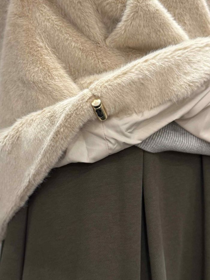 上品なミンクファーを思わせるフェイクファー素材を使用したフーディーベスト。ふんわりとした毛足が高級感を演出し、羽織るだけでスタイリングに存在感を与えてくれるアイテムです。