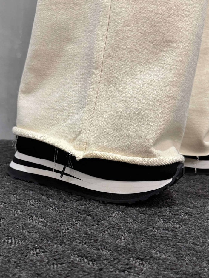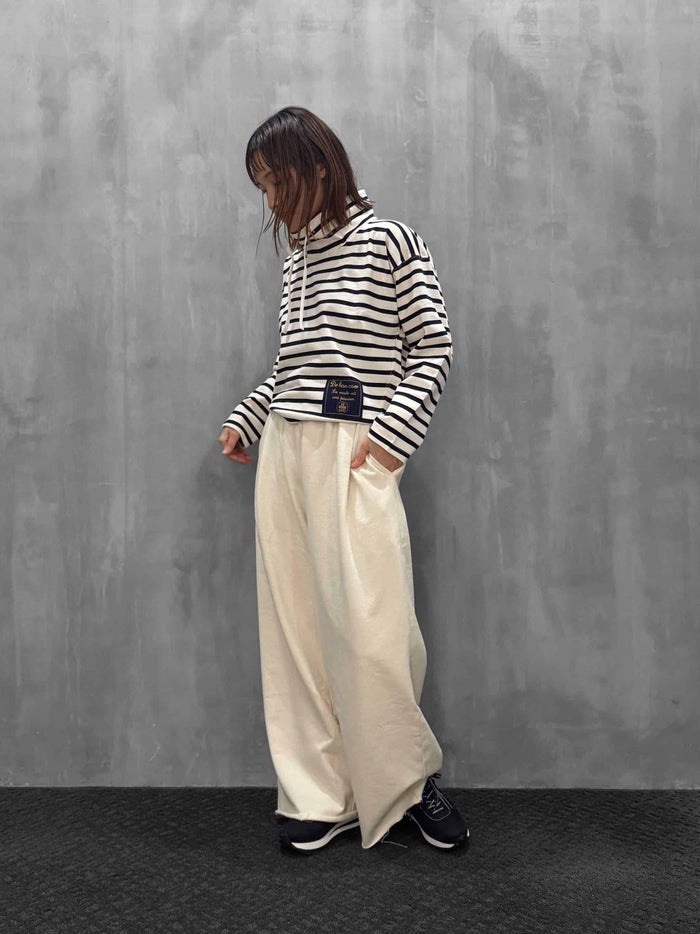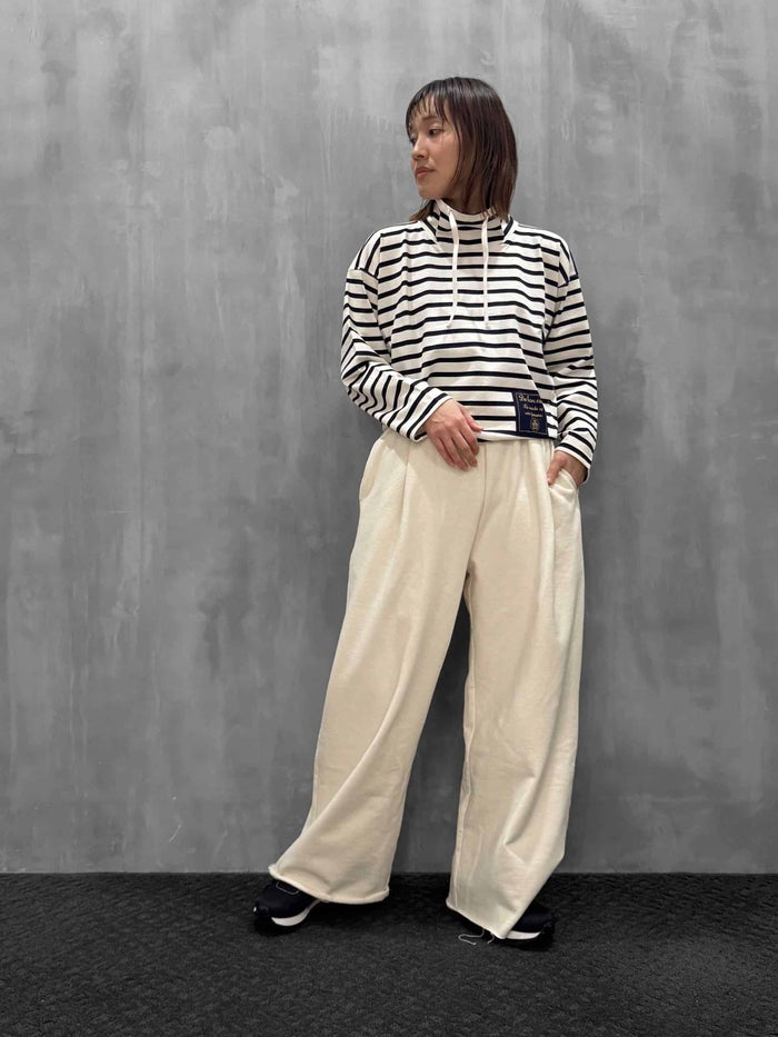 切りっぱなしの裾と後ろポケットのタグがポイントのスウェットパンツ。