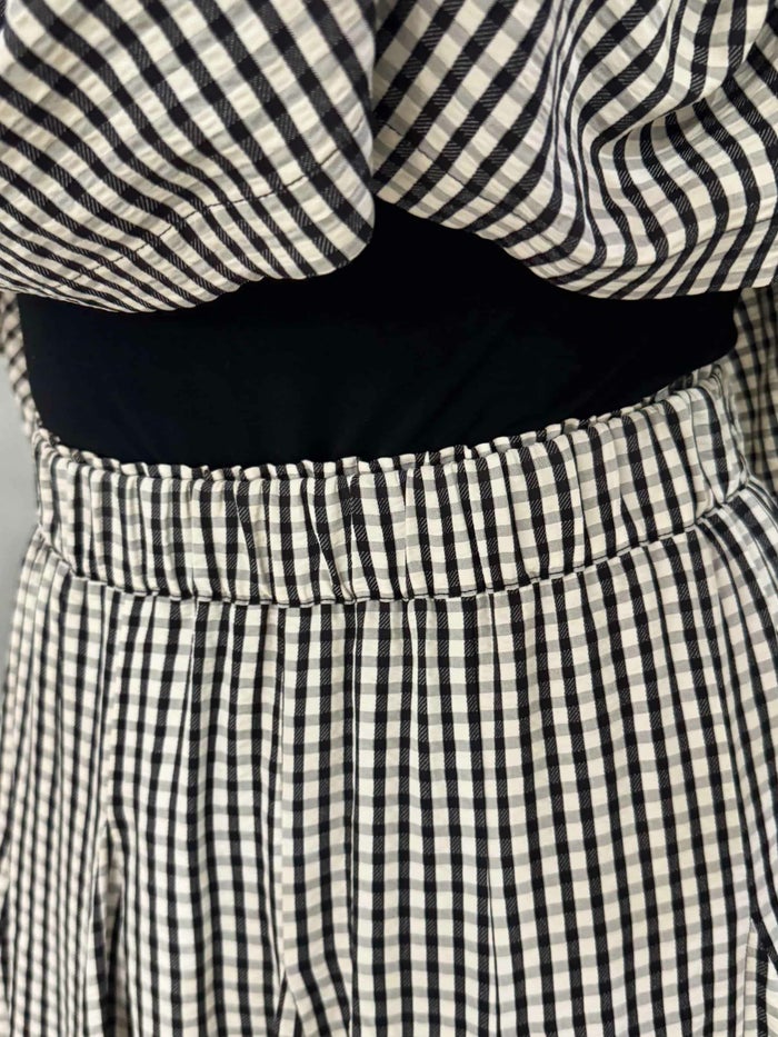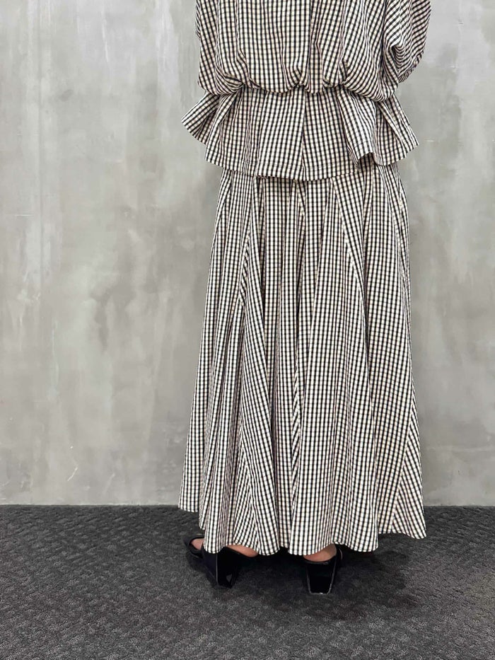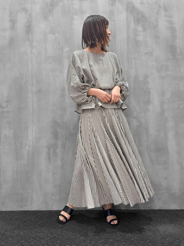 分量感たっぷりの贅沢スカート。素材には、ポリエステルレーヨンの先染めチェックを使用。レーヨンの光沢感とギンガムチェックの凹凸感が特徴です。ご家庭でのイージーケアにも優れた素材。ウエストはぐるりゴム仕様で、さらに内側のドローコードでもサイズの調節ができ、ハイウエストでもお腹の締め付けを軽減。切り替えをたくさん入れ、ウエスト周りはすっきり、裾に向かって分量感をしっかり取った女性らしいシルエットが魅力的な一着です。