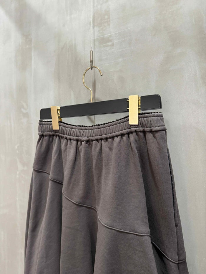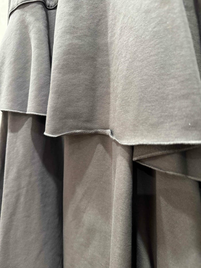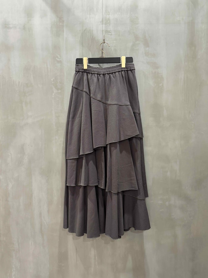 たっぷりフレアーを施したティアードスカート。コットンの軽いミニ裏毛の素材を使用。毛羽立ちが少なく、ふくらみのある柔らかい風合いが特徴です。着丈やフレアー分量など、全体の細やかなバランスにこだわった一着。アシンメトリーなデザインと、流れるようなカッティングで美しいドレープになるように設計しています。カジュアルなスウェット素材にフェミニンなディティールをクロスさせたMOOLA KALAHらしい一着。動く度に生地が動き、ドラマチックなシルエットがポイントです。ウエストはぐるりゴム仕様で、内側にはサイズ調整可能なドローコードを取り入れ、イージーな着心地もかなえます。シンプルなTシャツとのスタイリングはもちろん、綺麗すぎないリラックス感のある着こなしもおすすめ。