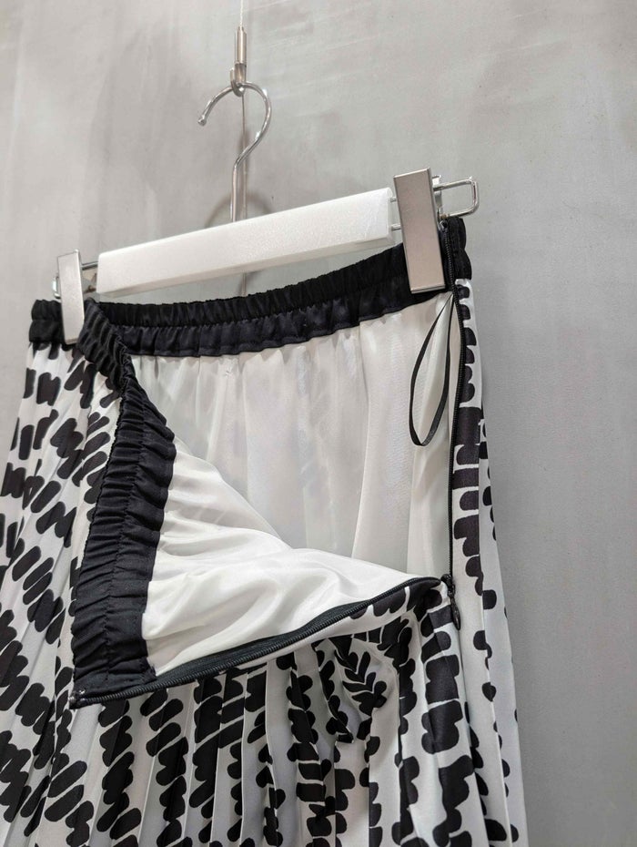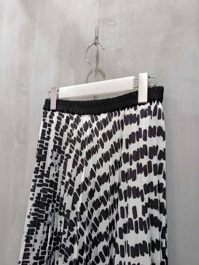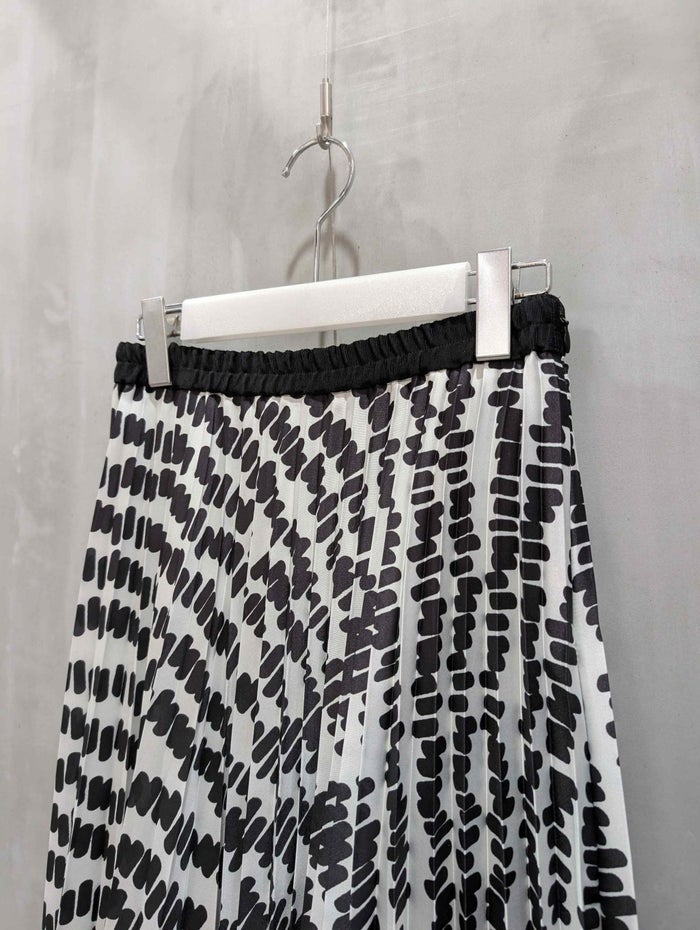 独特な柄とエレガントなシルエットのスカート。プリーツ加工で動きのあるデザインが目を引き、上品で女性らしい印象を演出してくれます。